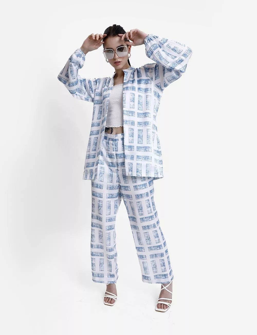 Product DetailsType:? Co-Ord Set Of 3Fit:? ComfortableNeckline type: Mandarin collarSleeves styling: Puff sleevesPattern: Horizontal & vertical blocksFabric: Modal SatinColor: White and BlueLength: FullOccasion: CasualNo of pieces: 03Lining: Yes