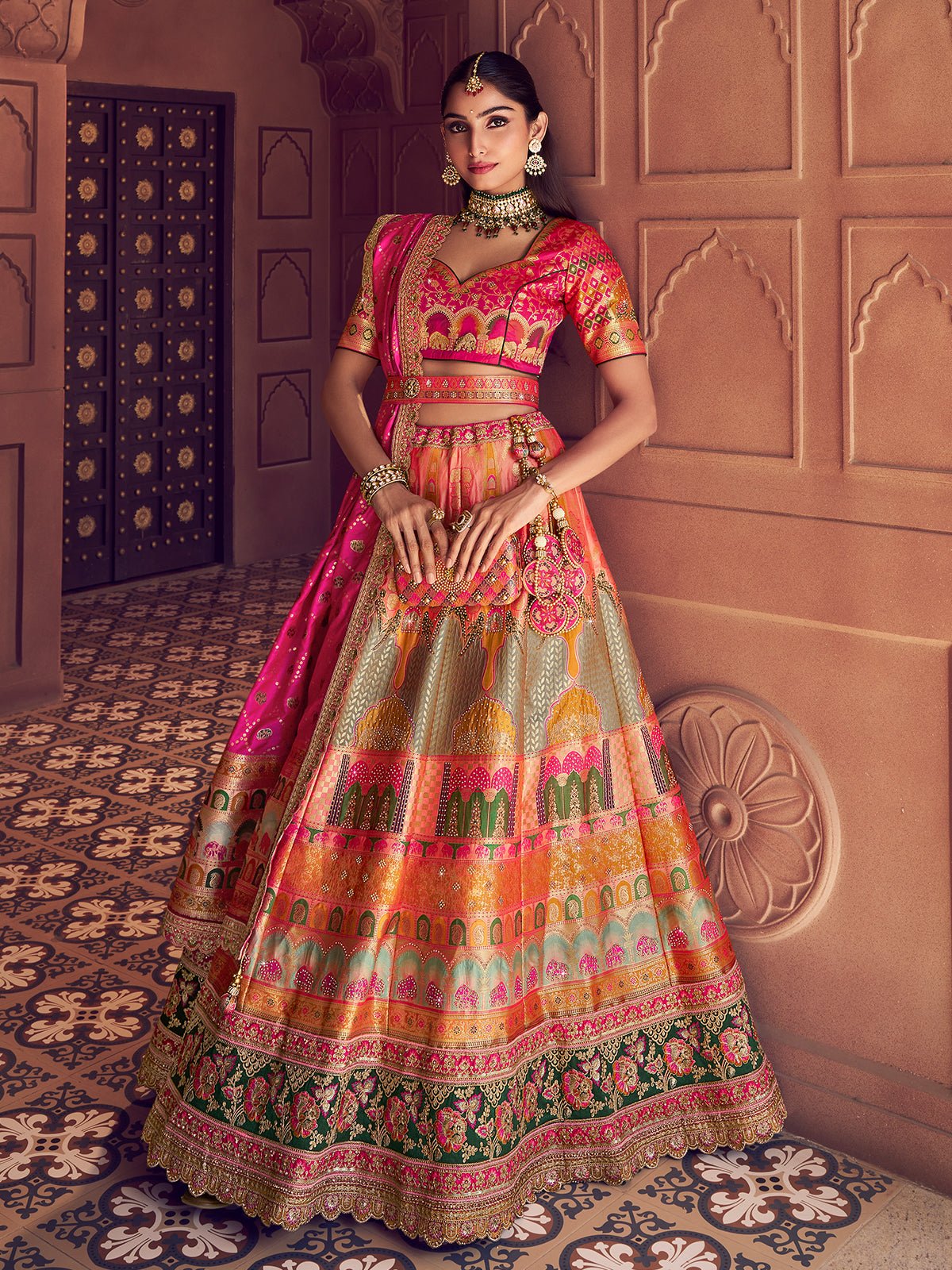 Elevate your bridal wardrobe with our heavy Banarasi silk lehenga choli, specifically designed for grand weddings and traditional ceremonies. This colorful ensemble features a stunning combination of zari weaving, embroidery, and stone work that creates a high-fashion look for any bride. The addition of Swarovski crystals and sequins provides a modern sparkle to the classic silk fabric, making it a standout piece for your big day.