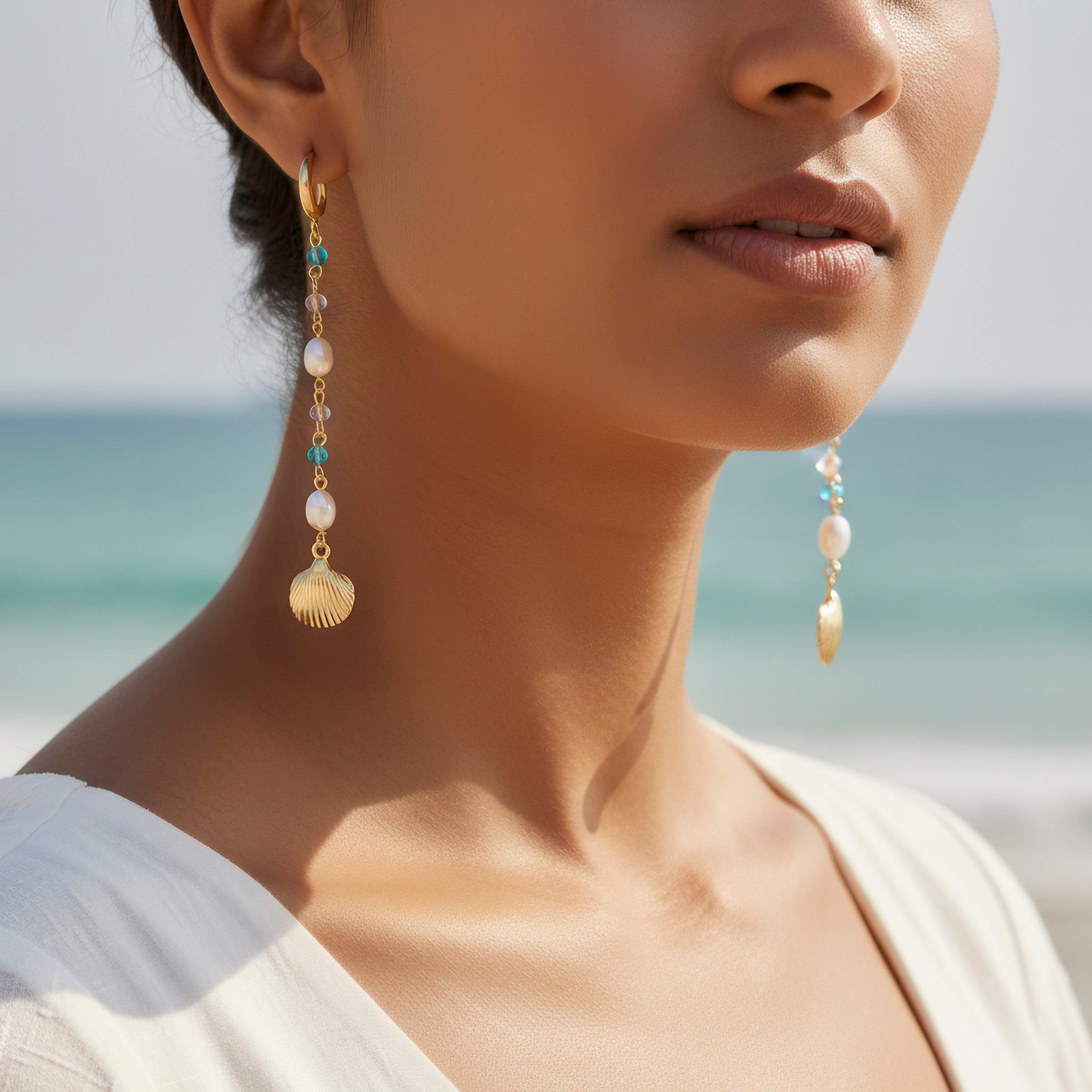 These sophisticated long dangling earrings blend a contemporary, delicate design with the depth of traditional craftsmanship. The piece is a lovely combination of glossy pearls and tiny Chinese-style beads that create a timeless, gentle charm. A beautifully crafted shell charm hangs elegantly at the bottom, adding a hint of coastal style and a distinctive focal point to the design. All-day comfort is guaranteed by the lightweight design, and they stand out for both special and casual settings because to the elaborate craftsmanship. These earrings, which combine cultural artistry and modern style, are ideal for creating a statement with evening wear or completing a stylish daily ensemble. They are a multipurpose and striking addition to any jewelry collection.