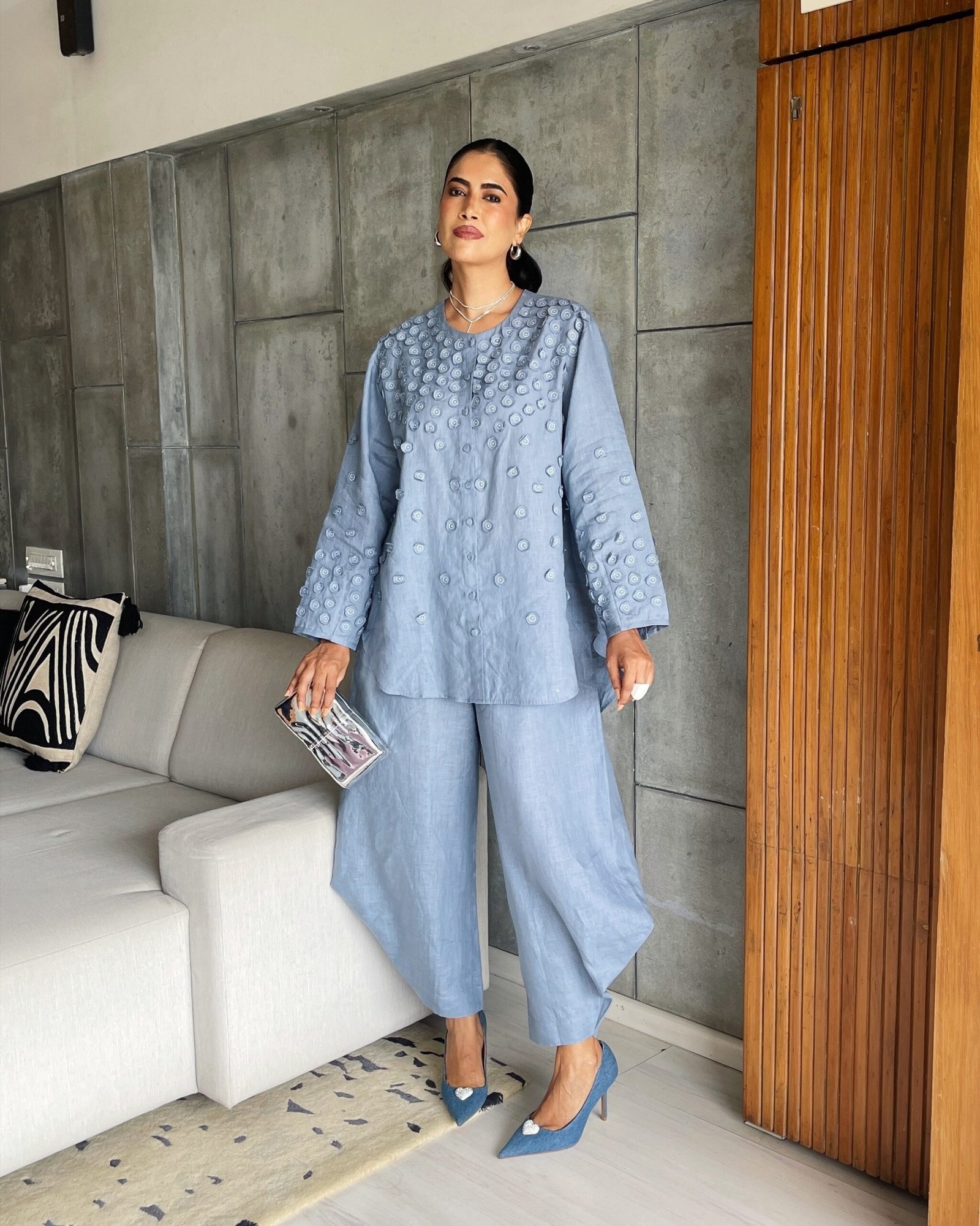 Crafted in 100% linen, this co-ord set is a modern blend of tailoring and artisanal detail. The round-neck shirt features a fabric button-down front, back pleat with French knot embroidery, and circle surface manipulation all over for a textured finish. Paired with elasticated cross-fall pants, this set balances structure with ease?perfect for elevated everyday wear.
