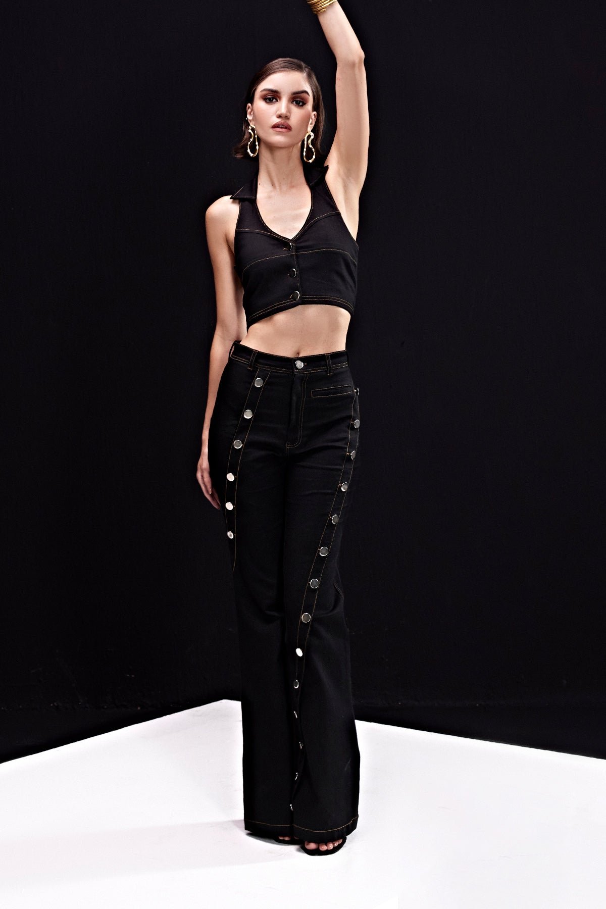 Black Buttoned Denim Pants Co-ord Set with Halter Waistcoat