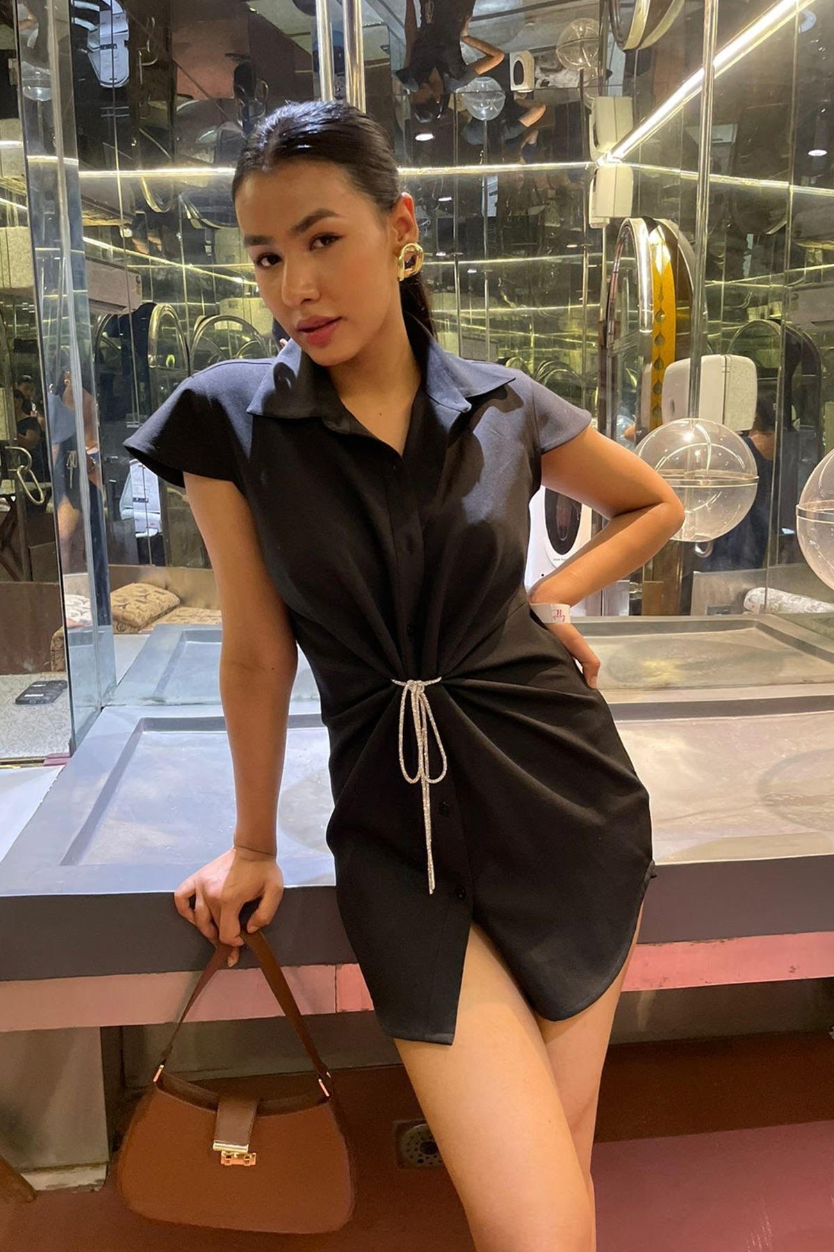 Dis-featuring the statement black subtle knotted gathered crystal string dress.