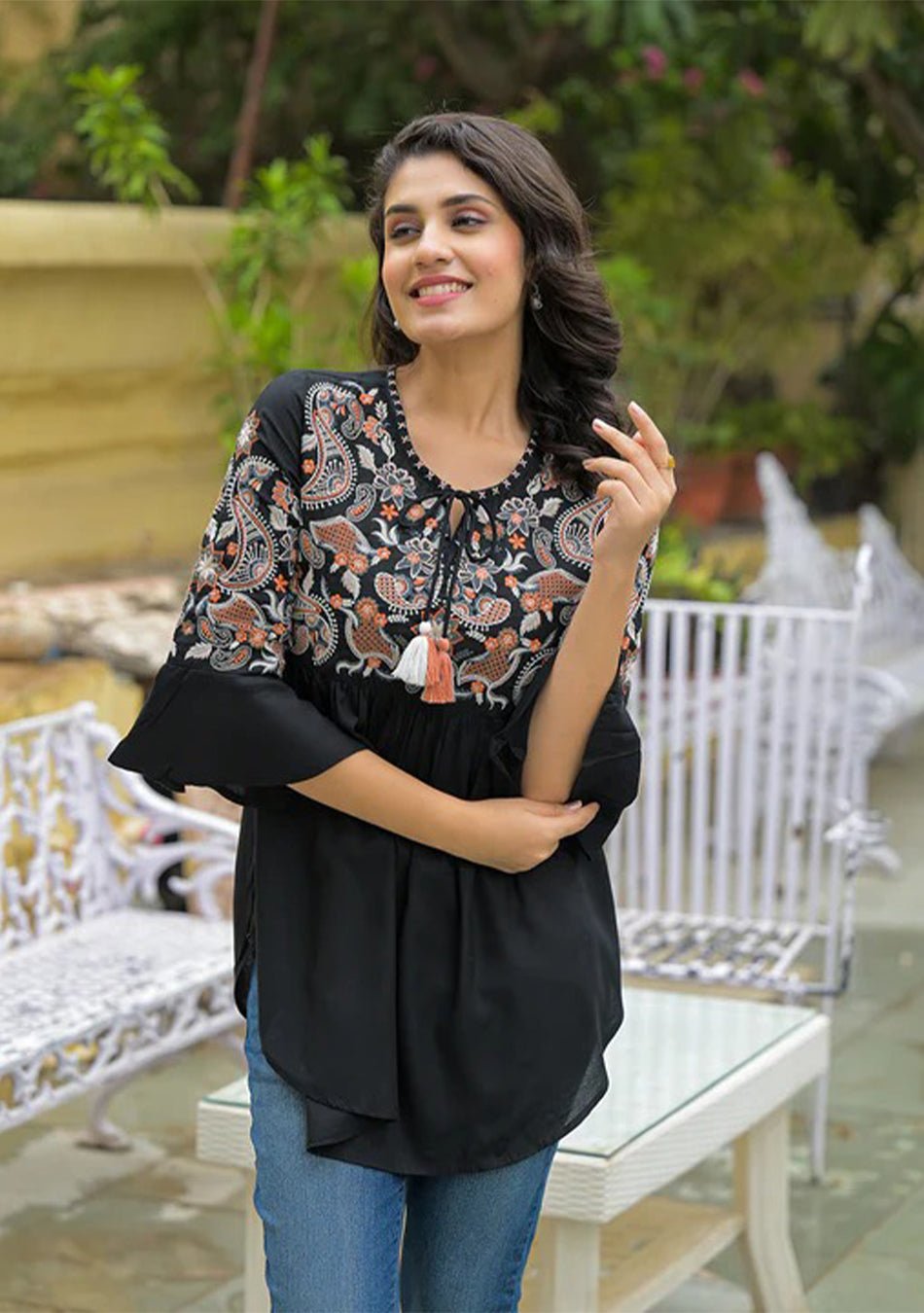 Be the first to review “Black Embroidered Rayon Curved Hemline Top” Cancel reply