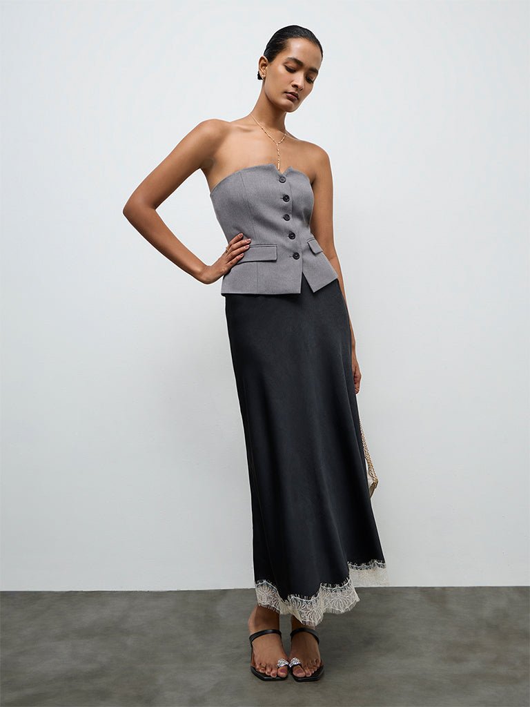 launches this black skirt crafted from a textured fabric that offers a soft feel and depth in design. The graceful drape of the fabric creates gentle volume, enhancing its elegant movement. The hem is finished with contrast lace details that elevates it polished look, suited for both casual and refined styling.