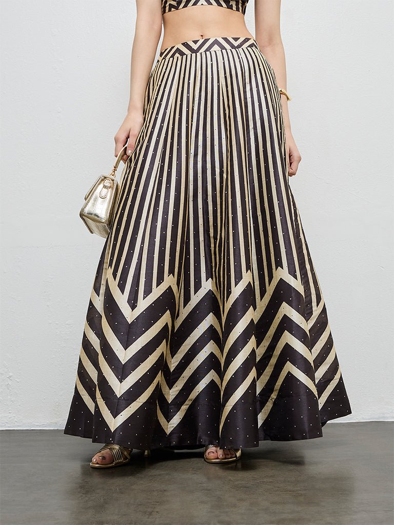 Step into every festive occasion with quiet confidence in this black skirt from . Featuring a bold combination of stripe and chevron prints, it is designed in a voluminous flared silhouette that flows effortlessly to the floor. The lightweight fabric drapes beautifully while the elastic waist allows a comfortable fit. Finished with side pockets for practicality, this creates a show stopping ensemble with a matching top.
