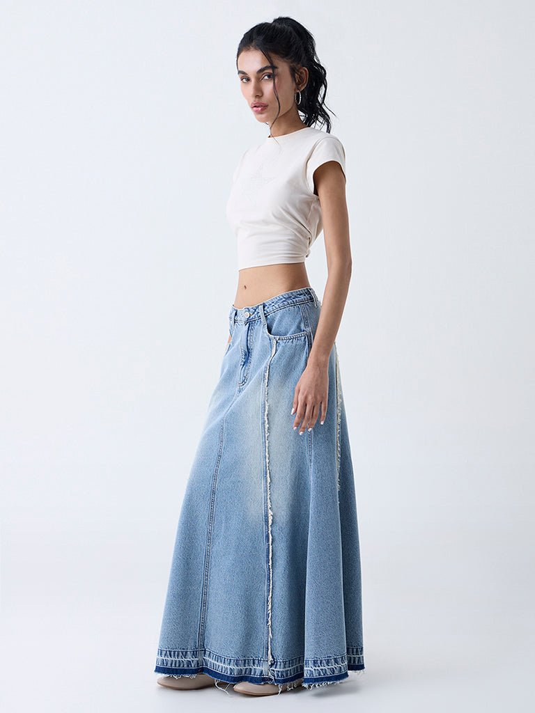 When you want denim with extra attitude, this blue maxi skirt from s. Designed with a faded finish and a fluid longline silhouette, it is crafted from pure cotton for breathable comfort. Finished with a button-zipper fly, belt loops and functional side pockets, the fringe detailing adds a cool, statement edge.