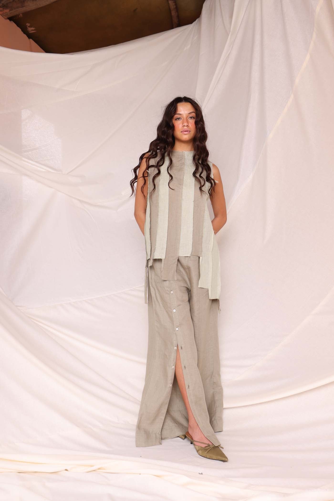 Modern and artisanal, this European linen co-ord set is designed with unique detailing for elevated everyday wear. The sleeveless paneled top features alternating strips with raw edges, an open back secured with tie-ups, and deconstructed finishes for a contemporary look. Paired with wide-leg pants featuring a side button-down panel, back elastic, and practical front pocket, it balances comfort with statement style.