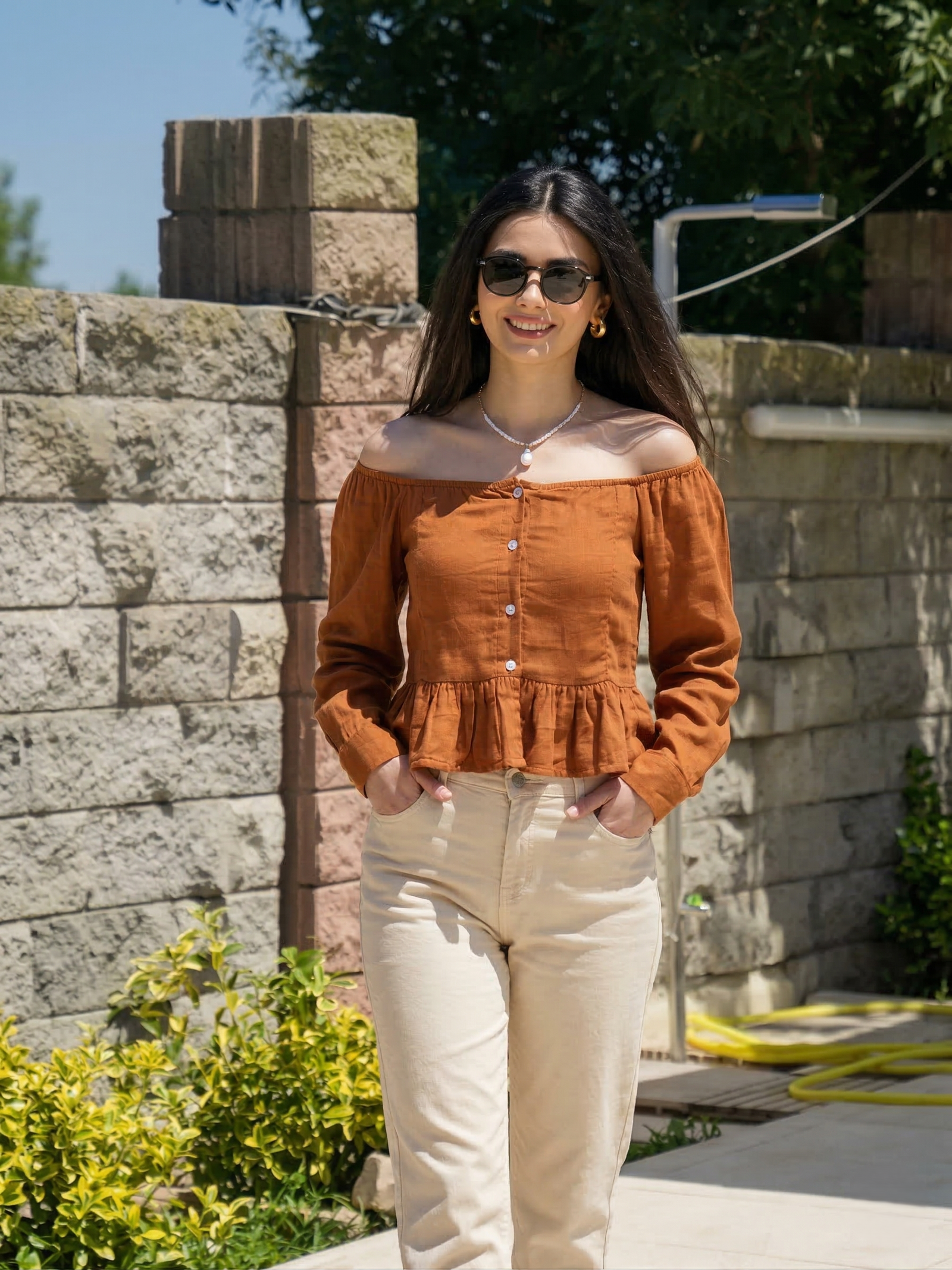 Brown?off-shoulder casual top featuring a modern peplum silhouette and elegant front buttons. The flowy hemline gives a flattering fit, making it ideal for daily wear, college, shopping, or casual gatherings.