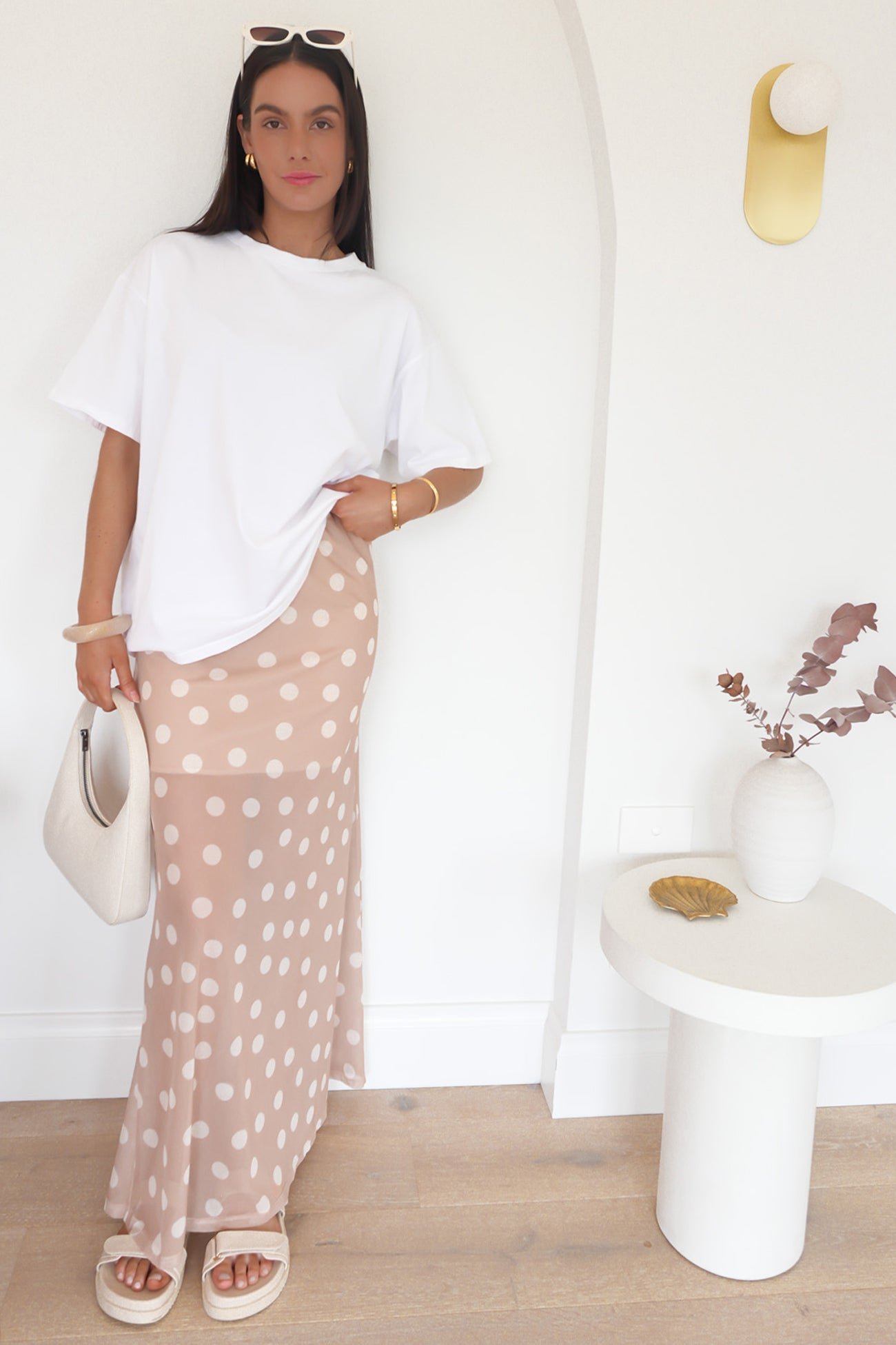 Soft and flowy, the Maxi Skirt features a flattering mid to high rise fit with an elasticated waistband for comfort. Designed in camel with all-over polka dots, it?s lined to just above the knee and perfect for effortless everyday styling.