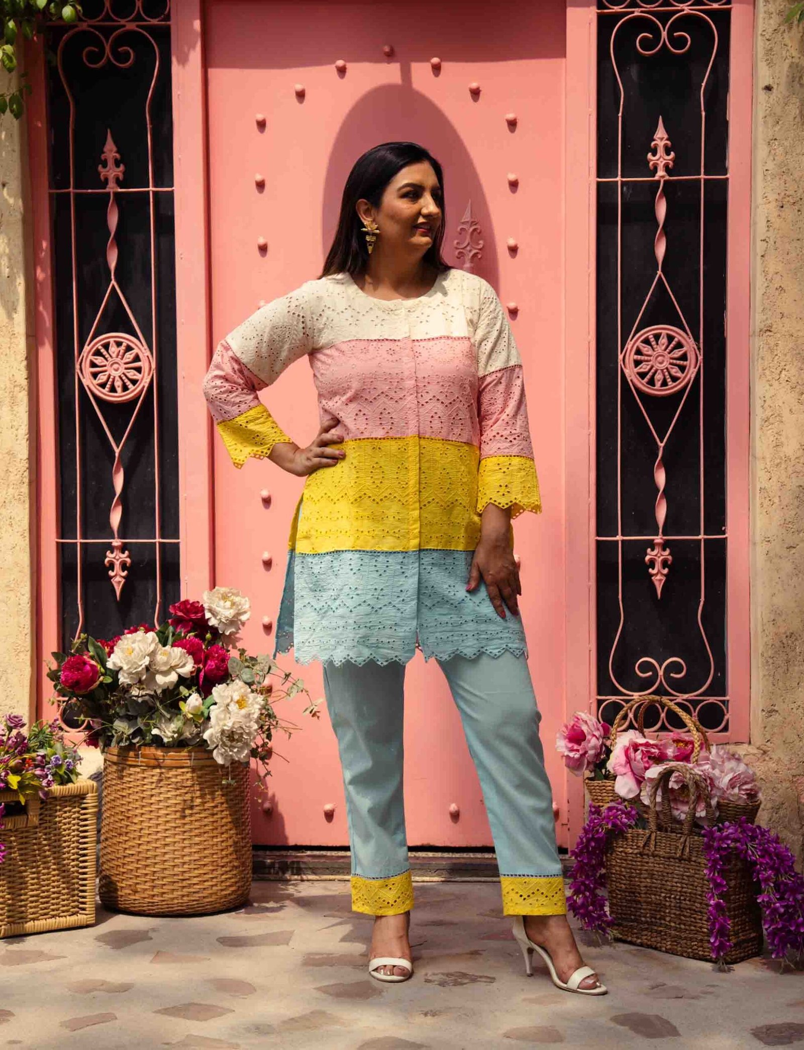 Candy style co-ord set in three pastel colour blocking in Hakoba fabric. It has a round neckline with placket, 3/4th sleeves, paired with straight pants with Hakoba border and lace. ?