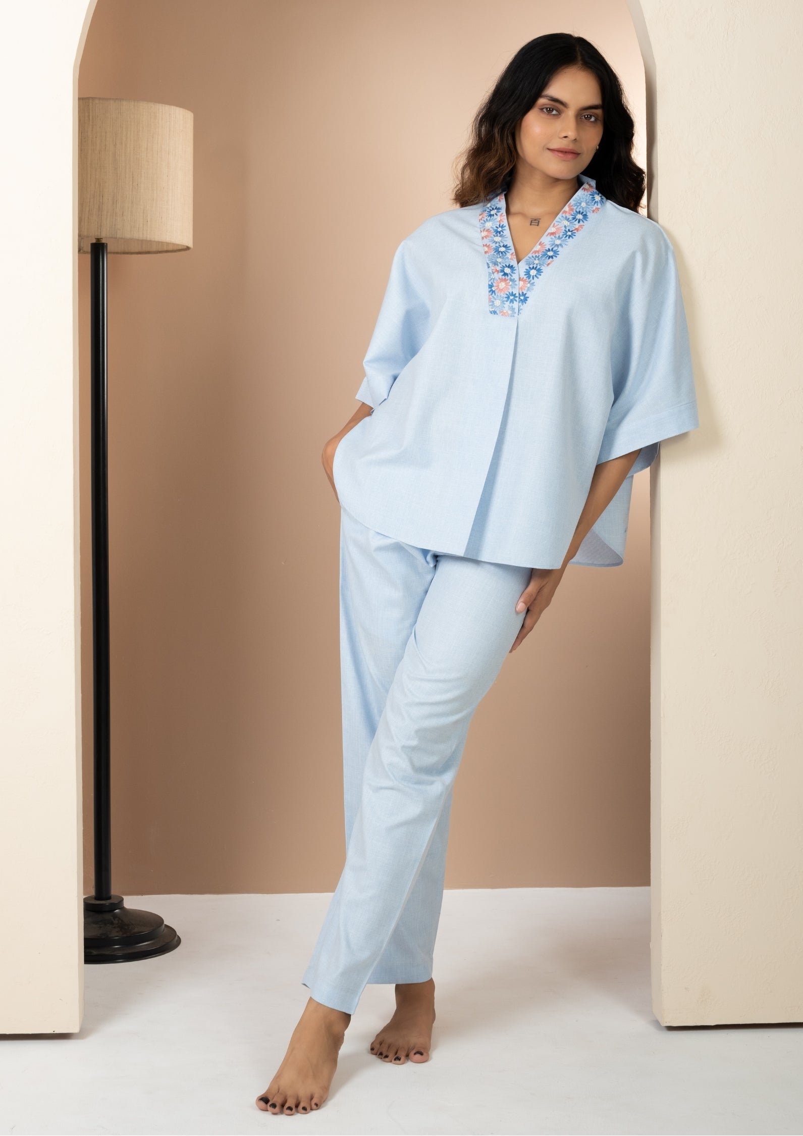 Celeste Charm is crafted in a calming powder-blue shade and elevated with delicate hand embroidery along the V-neckline. The relaxed cape-style top paired with straight-fit bottoms creates a silhouette that is effortlessly elegant yet unbelievably comfortable.