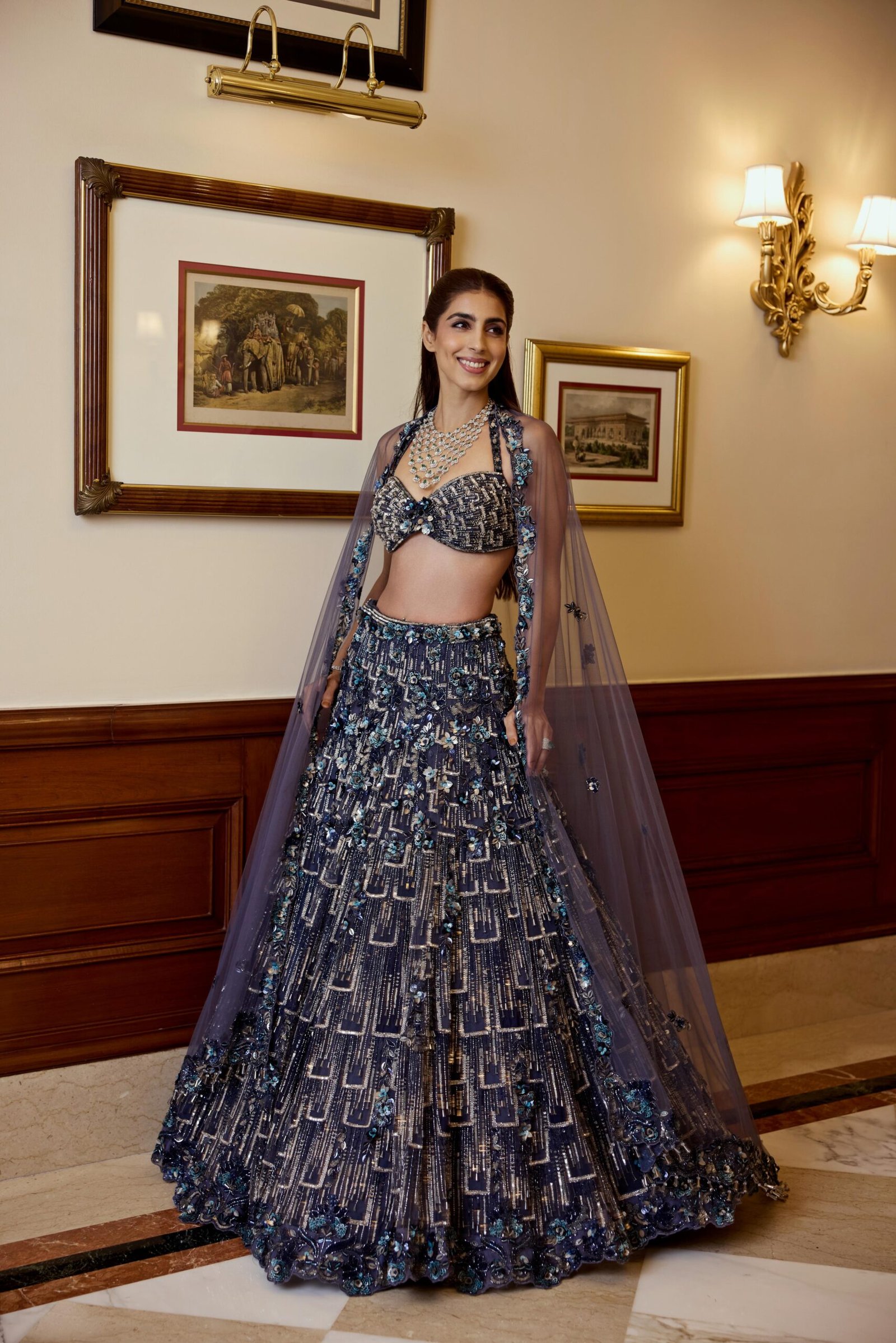 The garment is richly adorned with hand-embroidered motifs?including intricate paisleys and rising sunbursts?crafted using zari and crystal sequins that shimmer brilliantly, like dewdrops on plumage, while the skirt showcases stunning crystal geometric work.