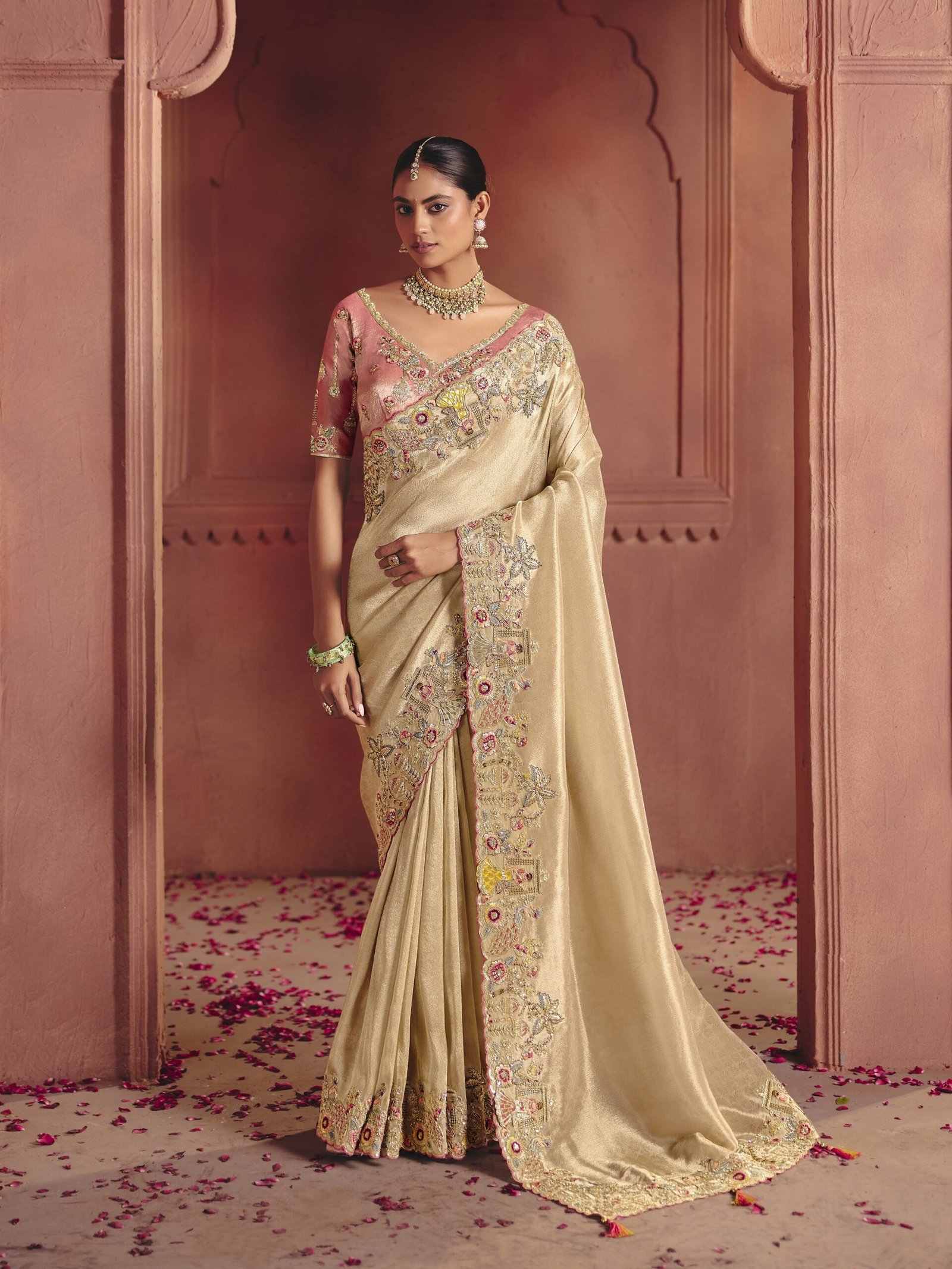 Blouse Detail: The contrasting rose pink blouse is designed with a heavily embellished neckline and sleeves, featuring detailed traditional motifs. Small, shimmering motifs are scattered across the body of the blouse to add a subtle sparkle.
