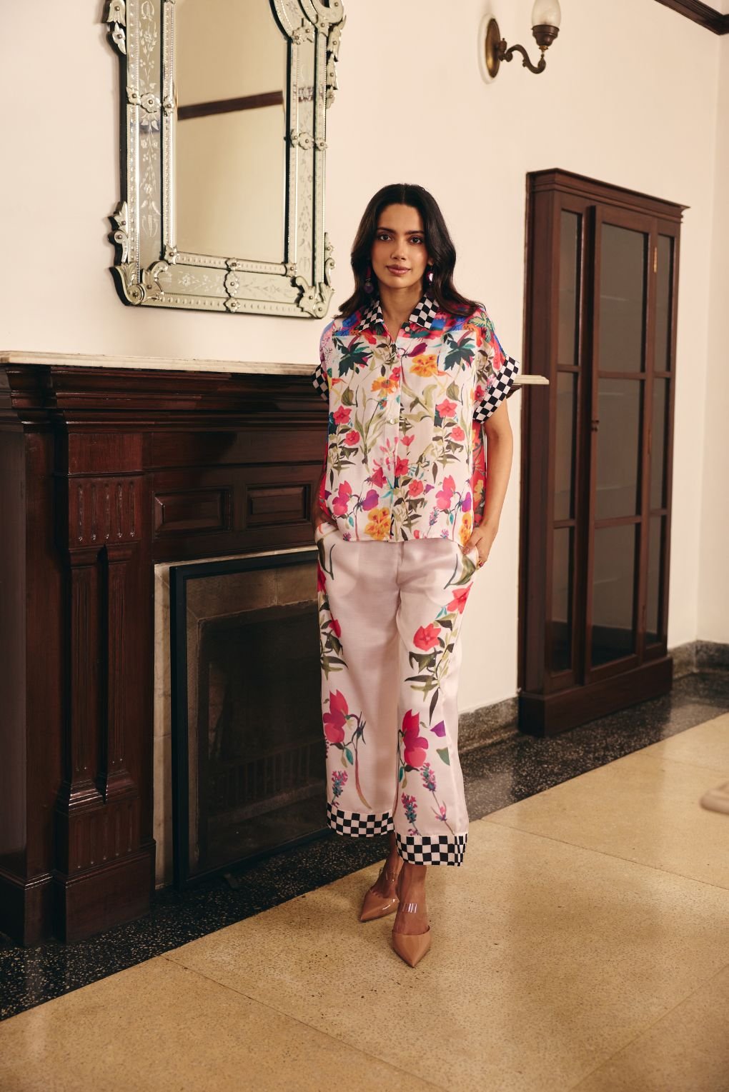 Bring modern elegance to festive occasions with this women?s co-ord set, crafted in luxurious satin fabric. The boxy-fit shirt showcases a dreamy hazy floral print, elevated with a bold contrast check-print collar and cuff detail. Paired with pyjama-style pants in the same hazy floral print, finished with a contrast check bottom hem and a comfortable elasticated waistband, the set blends relaxed ease with statement style?perfect for card parties and festive evenings.