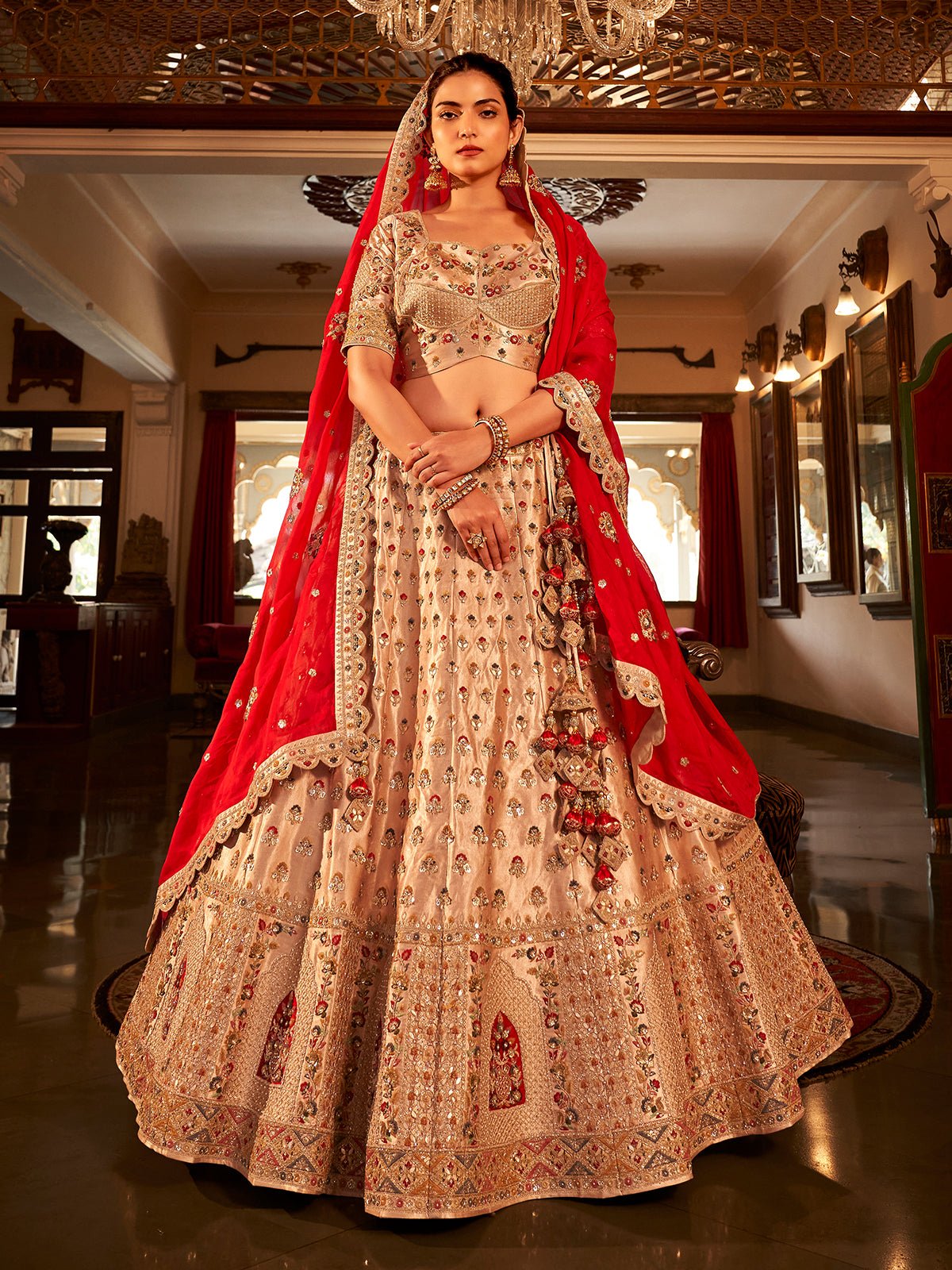 Complementing the neutral tones of the Chiku satin silk is a vibrant red tissue silk dupatta that adds a classic royal touch to the overall look. The dupatta is finished with detailed work that echoes the richness of the lehenga, providing a beautiful color contrast that is highly favored in current wedding fashion trends. Designed for comfort without compromising on style, this heavy work bridal outfit ensures a regal presence. Whether you are searching for the perfect wedding attire or a standout ensemble for a formal gala, this premium satin silk lehenga set delivers unmatched sophistication and timeless grace.