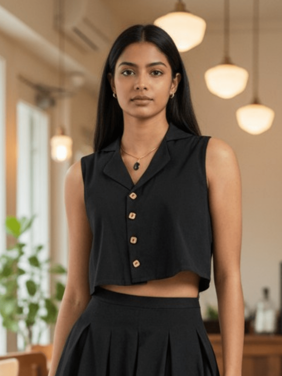 Introducing our Bri black sleeveless cropped top, a must-have for your summer wardrobe! Crafted in a pure handwoven fabric, this top is not only stylish but also sustainable. The front wooden button closure adds a touch of elegance to this already stunning piece. Pair it with high-waisted pants, skirts, or shorts for a chic and effortless look that’s perfect for any occasion.?