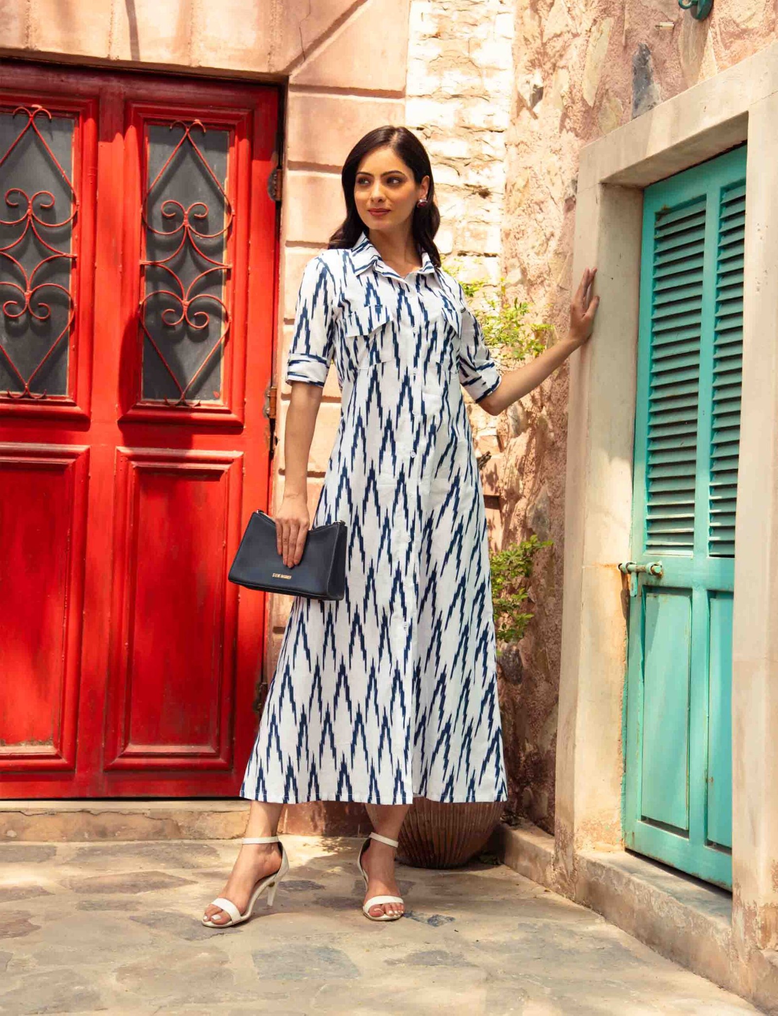 Product Name: Shirt Dress with Pockets ?Type: Ikkat Shirt Dress ?Category: Casual ?Fabric: Cotton ?Sleeve Type: 3/4th Cuff Rolled Up Sleeves ?Neckline: Shirt Collar ?Fit: Comfortable ?
