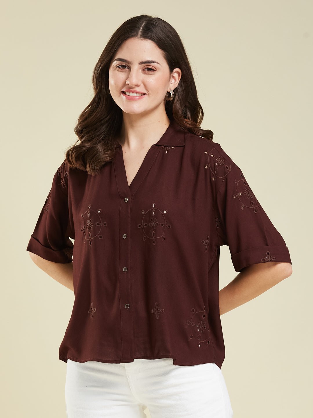 Stay effortlessly stylish in this Coffee casual shirt, crafted from a soft cotton blend with delicate prints. Featuring 3/4 sleeves and a relaxed fit, it’s perfect for everyday comfort with a chic touch.