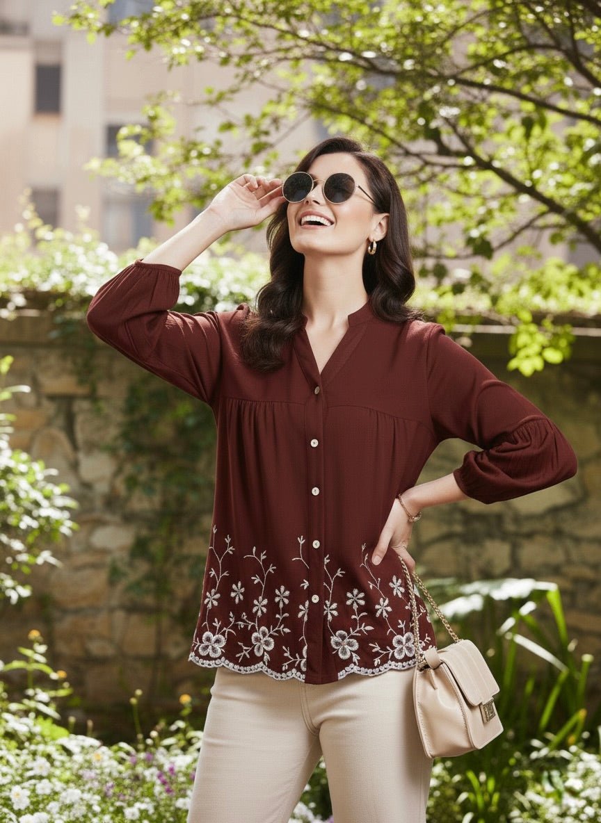 Coffee embroidered rayon shirt for women featuring elegant floral detailing and a comfortable fit. Perfect for office wear, brunch outings, and everyday style. Shop now for a chic and timeless wardrobe piece.