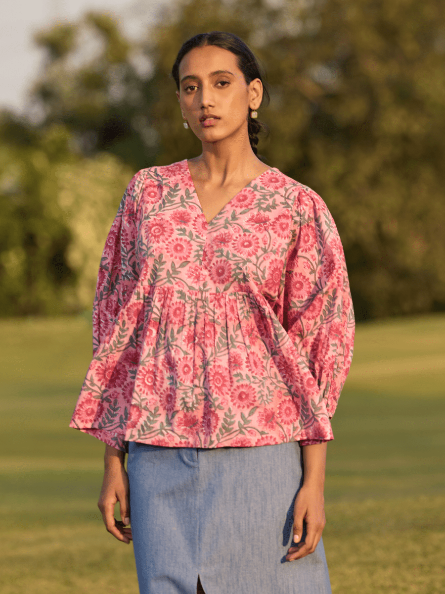 Brighten your day with the Edna Kimono Sleeves Top. This delightful top is crafted from soft, breathable cotton for ultimate comfort. It features a vibrant hand-block printed design that adds a cheerful touch to your wardrobe.