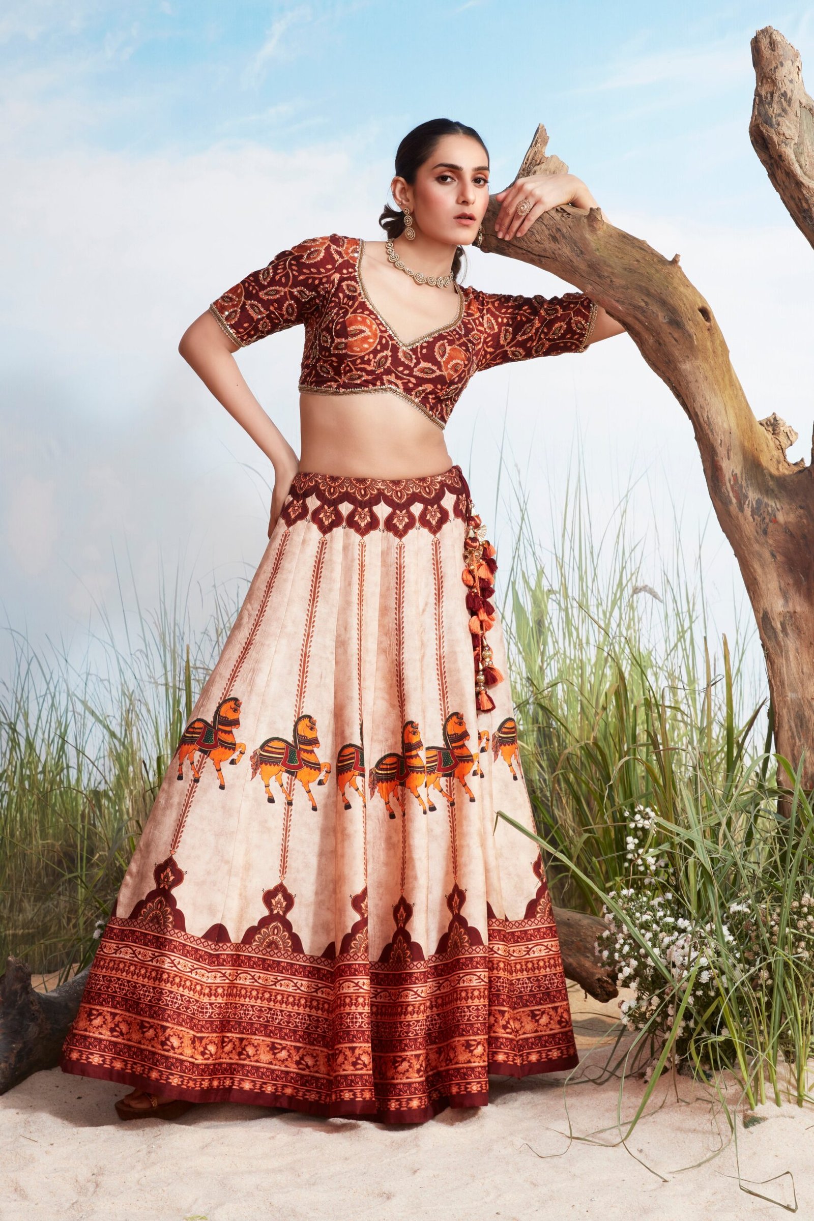 This gorgeous two-piece set offers a rich, traditional aesthetic with a modern twist on color-blocking and pattern-mixing, perfect for festive or semi-formal events. It features a heavily printed Lehenga Skirt paired with a contrasting patterned Blouse (with an open/keyhole back), both crafted from textured Raw Silk.