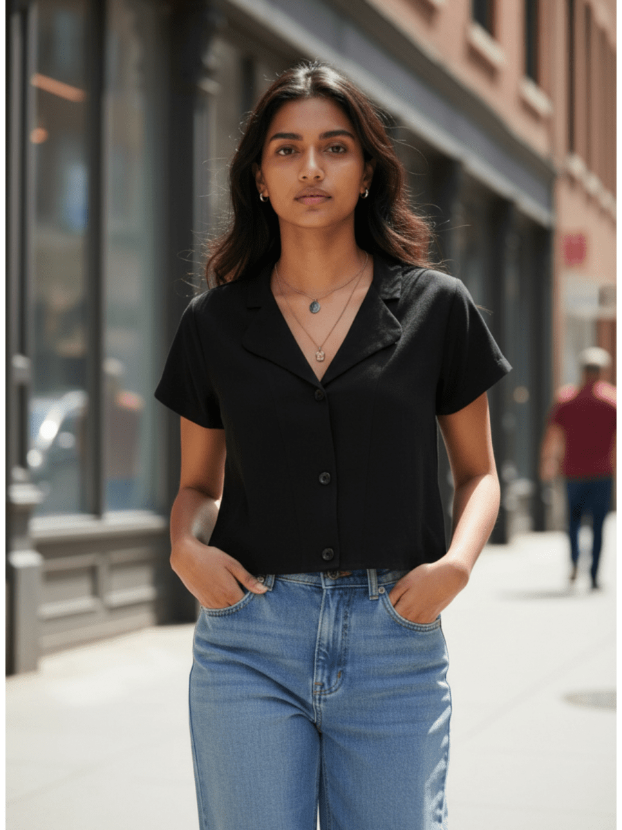Our Lena black, boxy cropped shirt crafted in pure handwoven fabric. This versatile piece is easy to wear with anything, whether you’re dressing it up for a night out or keeping it casual for a day at the office. The unique handwoven fabric adds a touch of texture and luxury to this already stunning shirt. With its flattering boxy cut and cropped length, this shirt is sure to become a staple in your wardrobe.