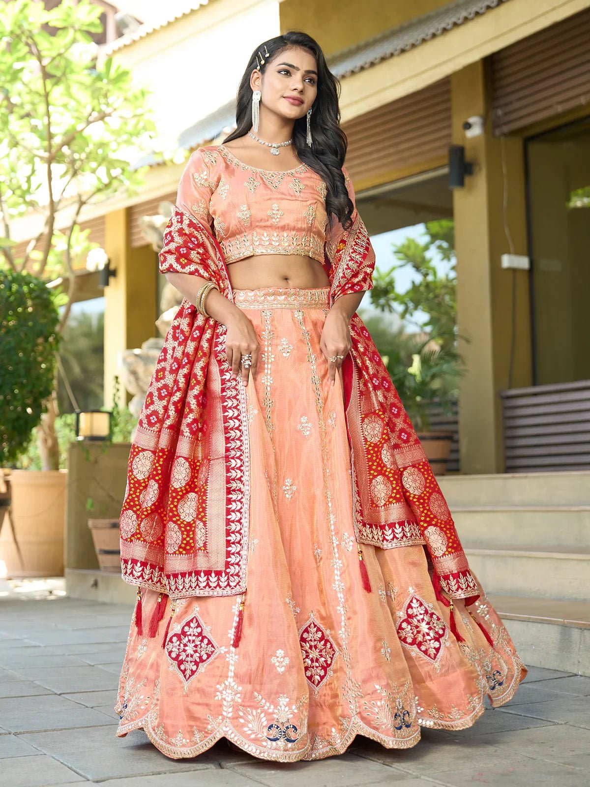 Step into timeless elegance with our Dark Peach Viscose Silk Lehenga, a perfect blend of regal craftsmanship and contemporary charm. This luxurious ensemble features intricate Gota work and shimmering sequin embellishments, making it the ideal choice for weddings and receptions. The Dola Silk blouse adds a rich contrast, while the traditional Bandhej dupatta enhances the ethnic grace of the outfit, giving you a complete festive look rooted in heritage.
