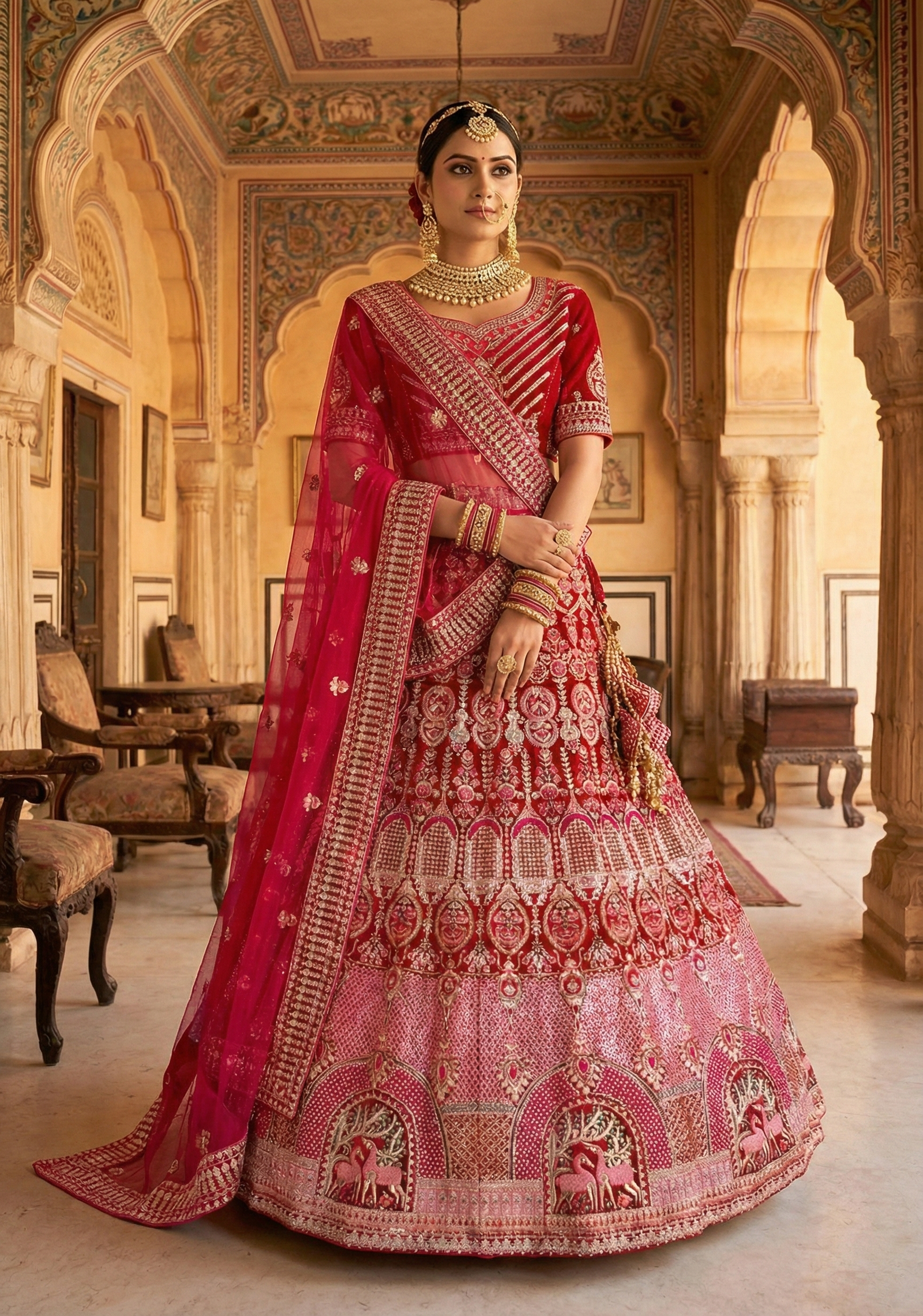 Color: Deep red blouse, Red skirt with a hint of blush pink shade and antique zari embroidery, paired with a soft pink dupatta.