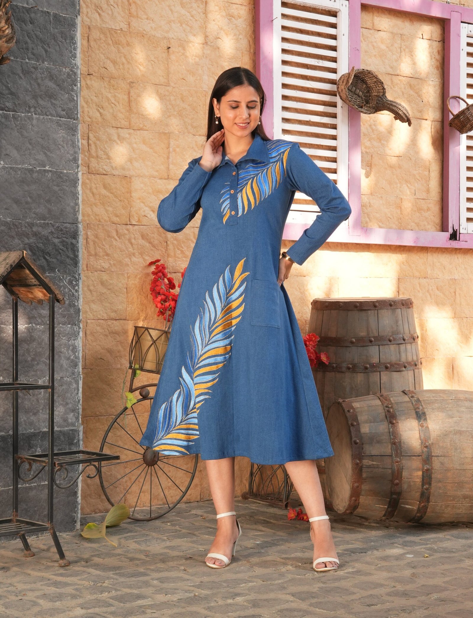 Product DetailsType: Denim A-Line with Embroidery DressFit: ComfortableNeckline type: Shirt CollarSleeves styling: Regular Long SleevesFabric: DenimColor: BlueLength:
