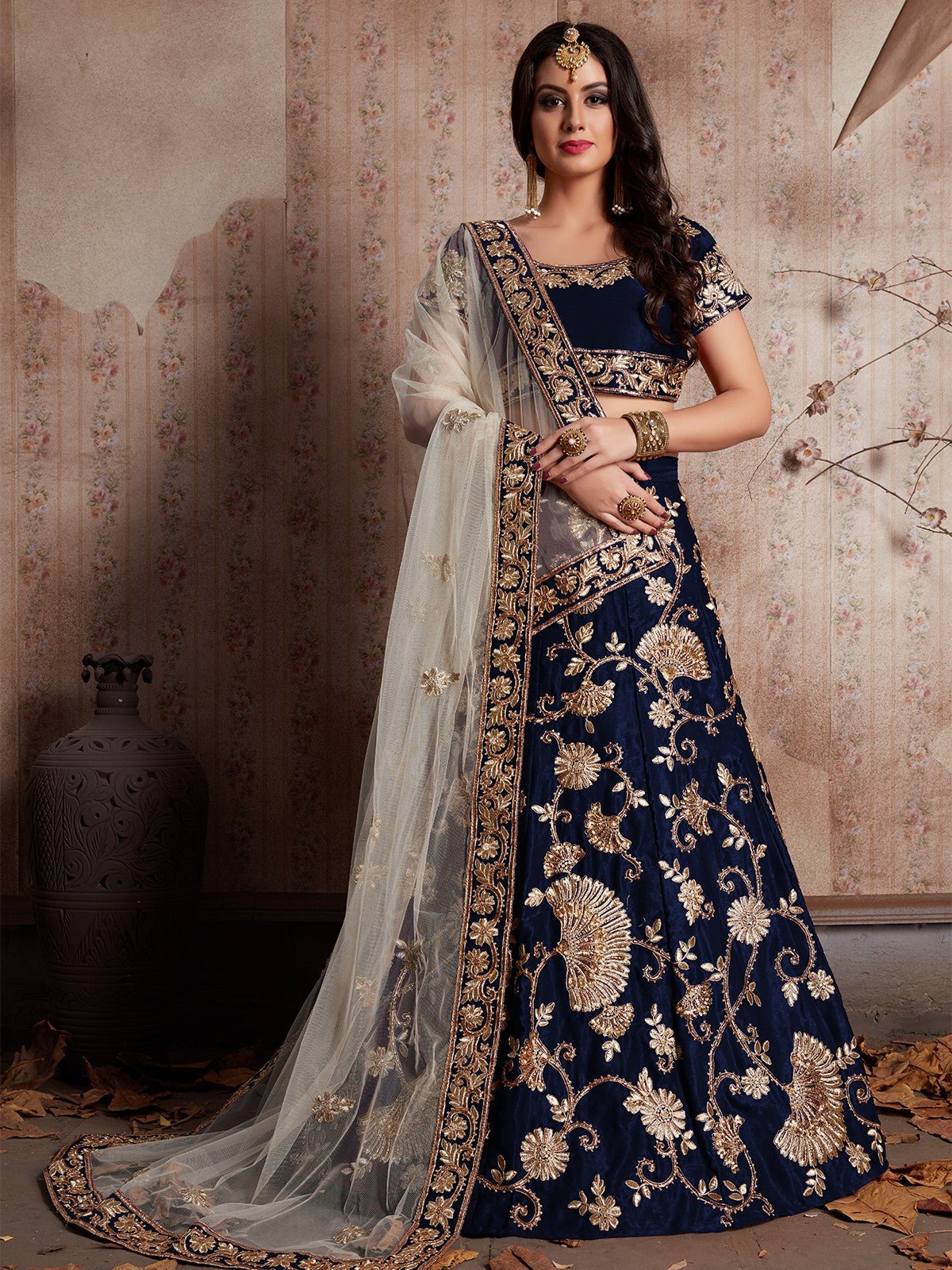 Add light to the celebration called life beaming in this lehenga, choli and dupatta set. Crafted on velvet silk, the set is beautified with embroidery work.