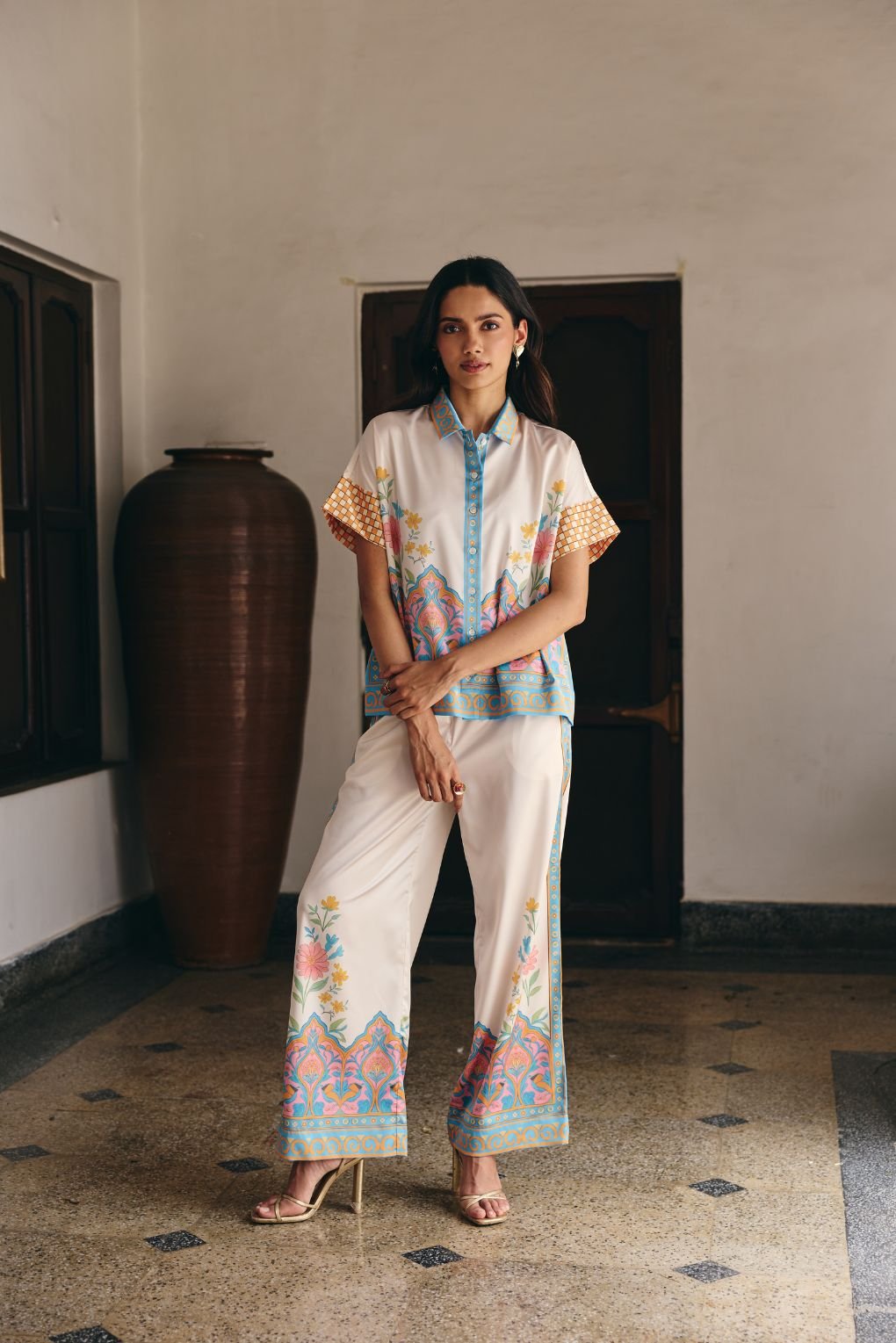 Celebrate in style with this women?s co-ord set, crafted in luxurious satin fabric for a sleek, festive finish. The boxy-fit shirt-style top features a trendy floral border print with check detailing on the sleeves, offering a playful yet polished look. Paired with straight-leg pants designed with a comfortable elasticated waistband enhanced by check detail and finished with a matching floral border print, the set creates a coordinated statement of elegance and modern charm?perfect for festive occasions.