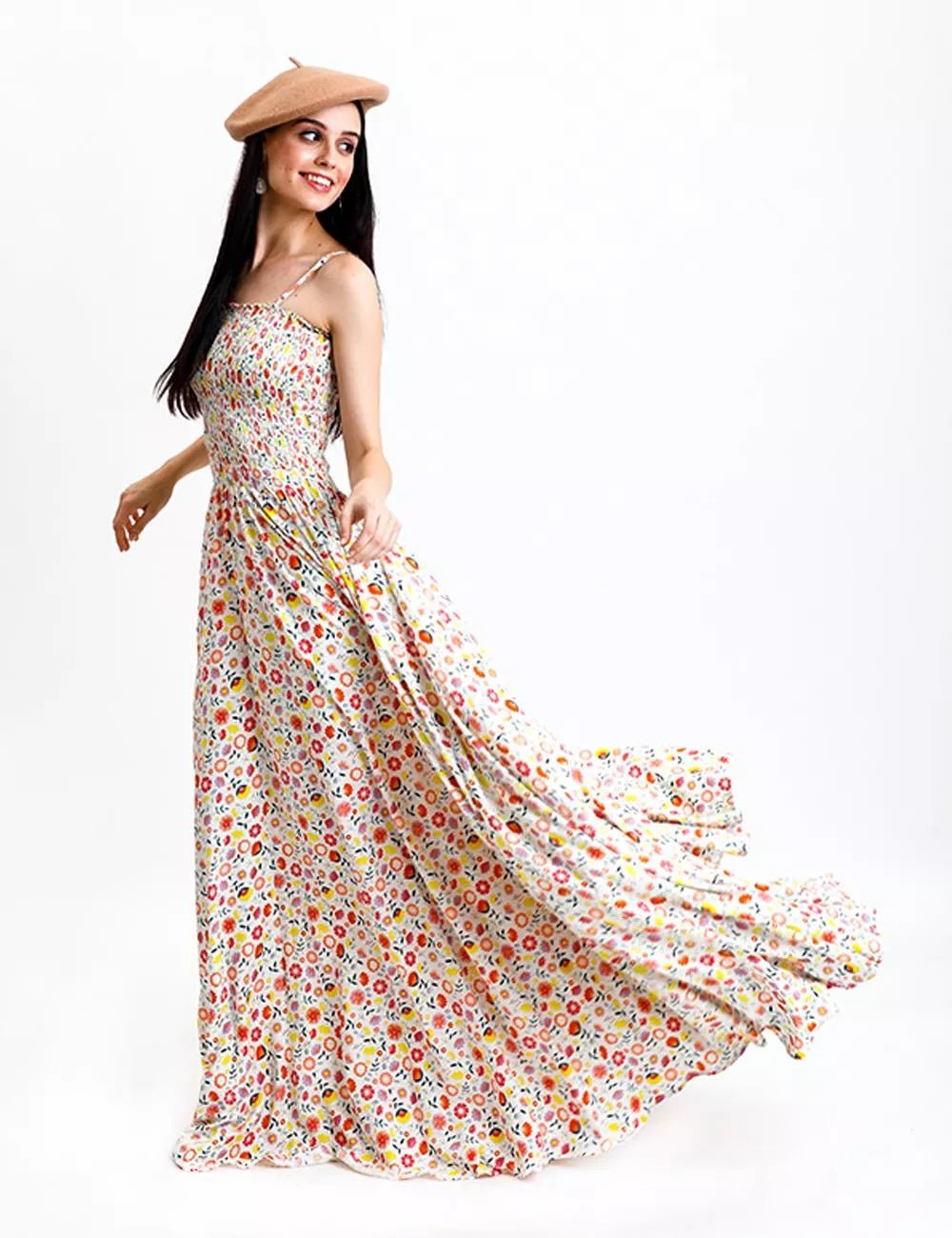 Floral Printed Maxi Flare Dress Has Spaghetti Adjustable Straps, Square Neckline, Smoking Yoke, Flared Hem.