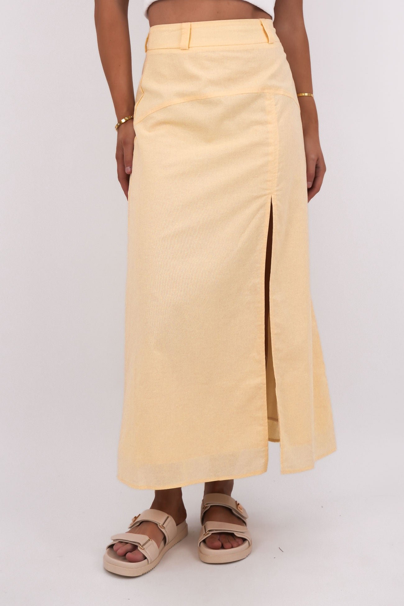 The Linen Maxi Skirt brings effortless elegance to sunny days, made from a breathable cotton-linen blend in a cheerful yellow hue. Featuring a side slit for ease of movement and belt loops for versatile styling, it’s your go-to for laid-back polish. Pair it with a tucked-in tank or cropped blouse for an elevated spring look.