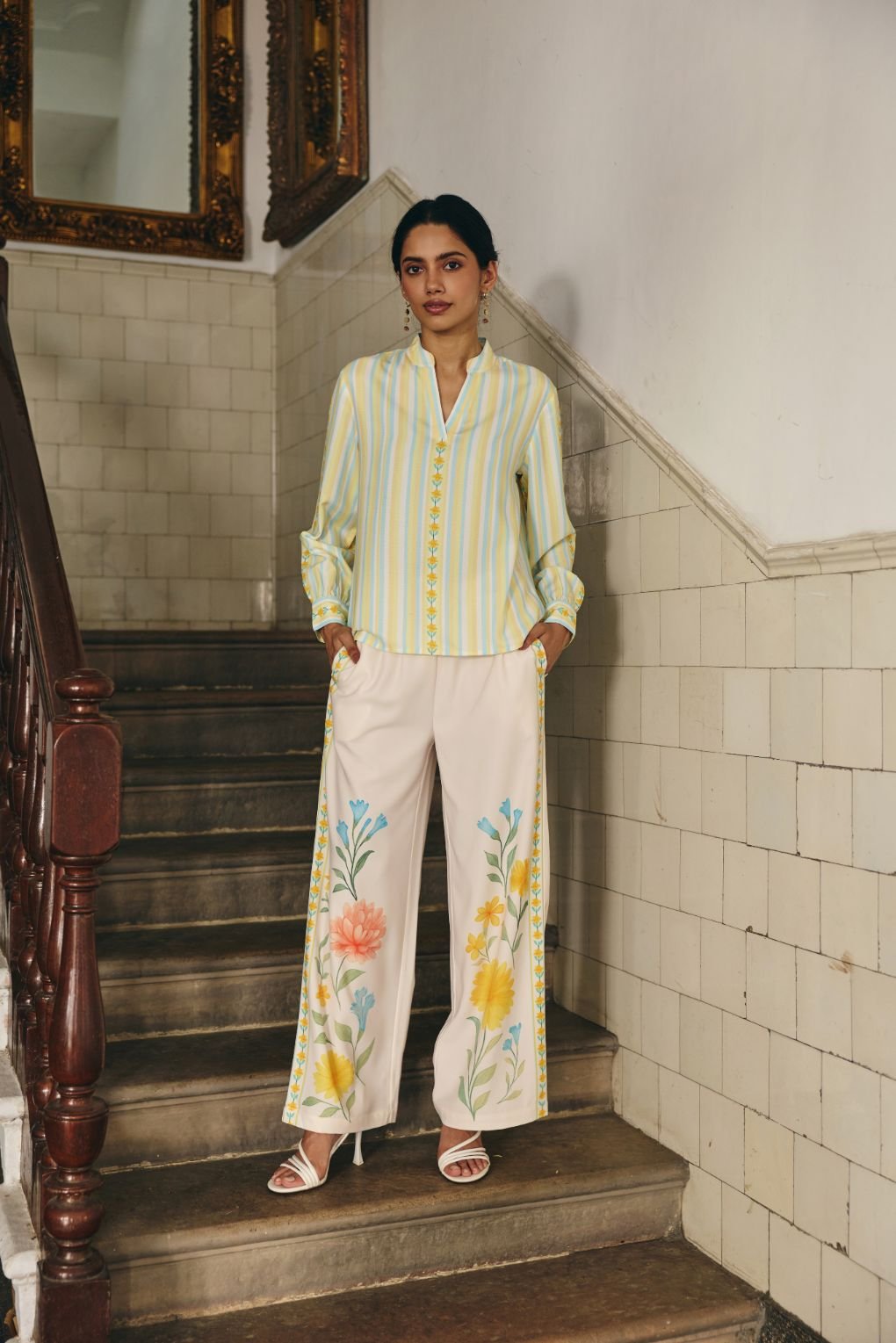 Celebrate in effortless style with this women?s co-ord set, crafted in luxurious dobby fabric. The Floripes tunic top showcases a playful stripe floral print, blending festive charm with modern elegance. It pairs seamlessly with matching floral print pants, designed with a comfort-fit elasticated waistband for ease and movement. Perfect for festive occasions like card parties and gatherings, this set delivers a coordinated look that?s chic, vibrant, and versatile.