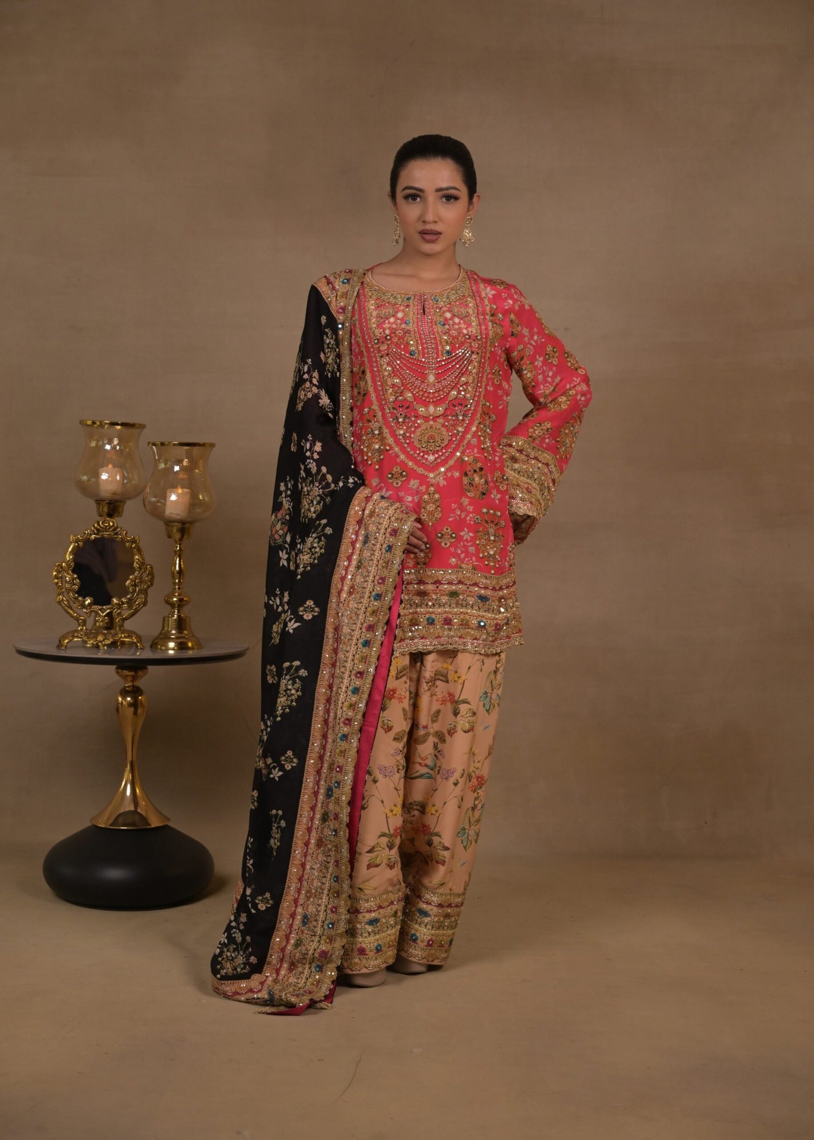 Exude regal charm in this vibrant rani pink and black ensemble, featuring a short kurta meticulously adorned with heritage-inspired hand-embroidery. Paired with a delicate botanical print salwar-style pant and a contrasting black dupatta, this look offers a sophisticated blend of traditional craftsmanship and modern festive grace.