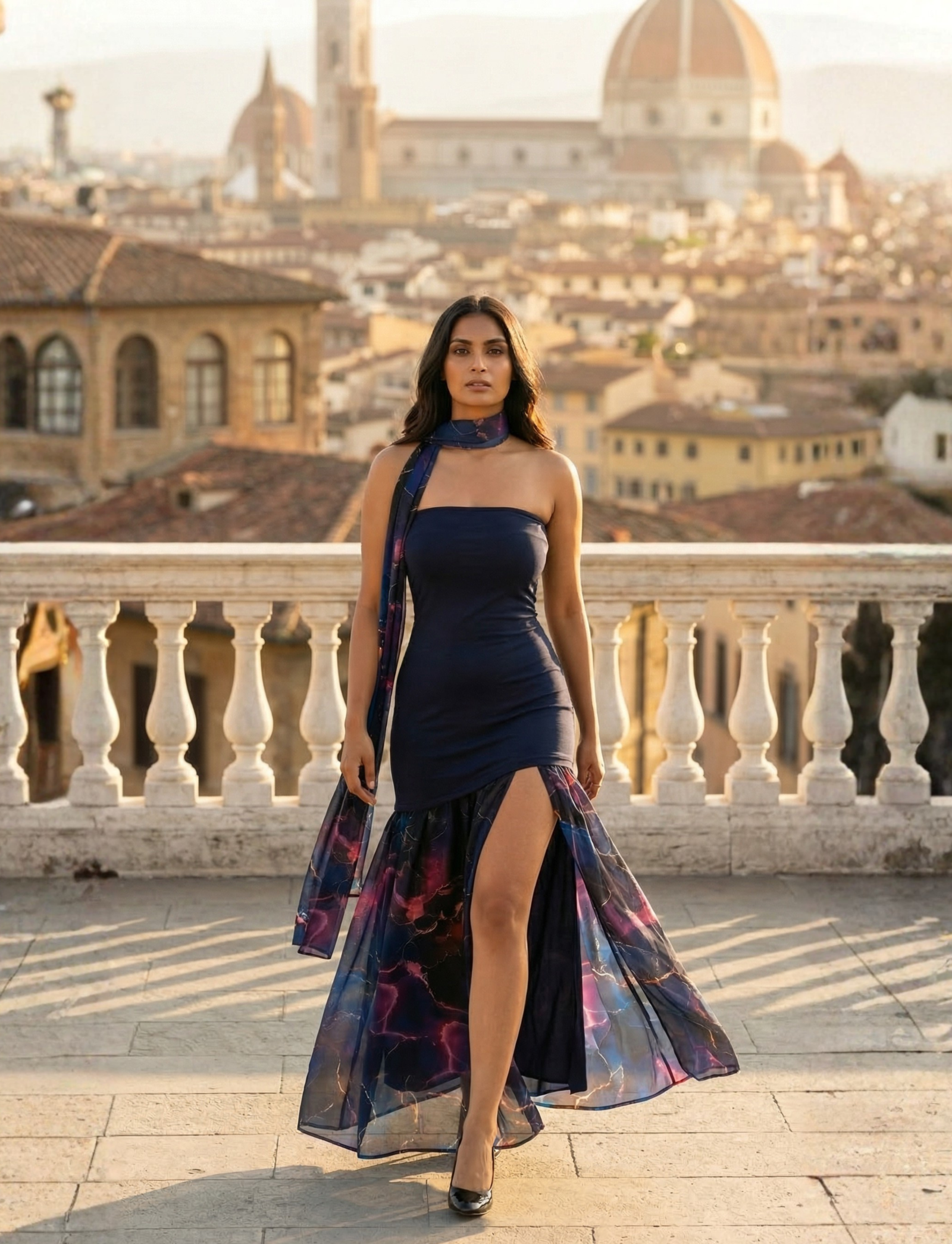 The lower panel stands out with a vibrant abstract cosmic print in shades of pink, purple, and teal, bringing a bold artistic flair to the look. A draped shoulder scarf detail adds fluidity and sophistication, perfectly blending modern minimalism with statement fashion.