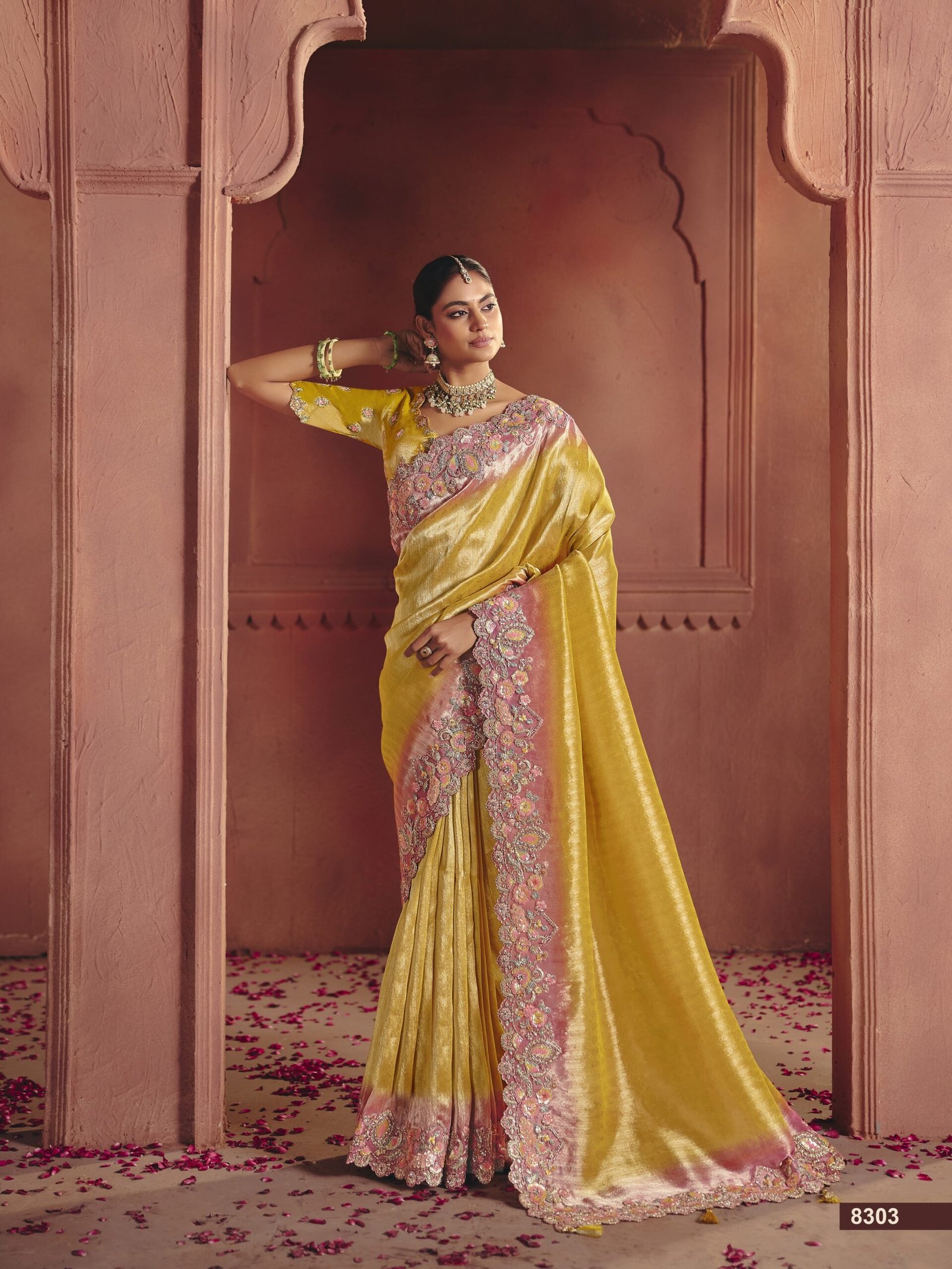 Saree Detail: This luxurious saree is crafted on a shimmering champagne gold base, framed by a bold mauve-pink border. The border features a contemporary scalloped edge meticulously detailed with intricate floral motifs in zari, sequins, and multicolored threadwork.
