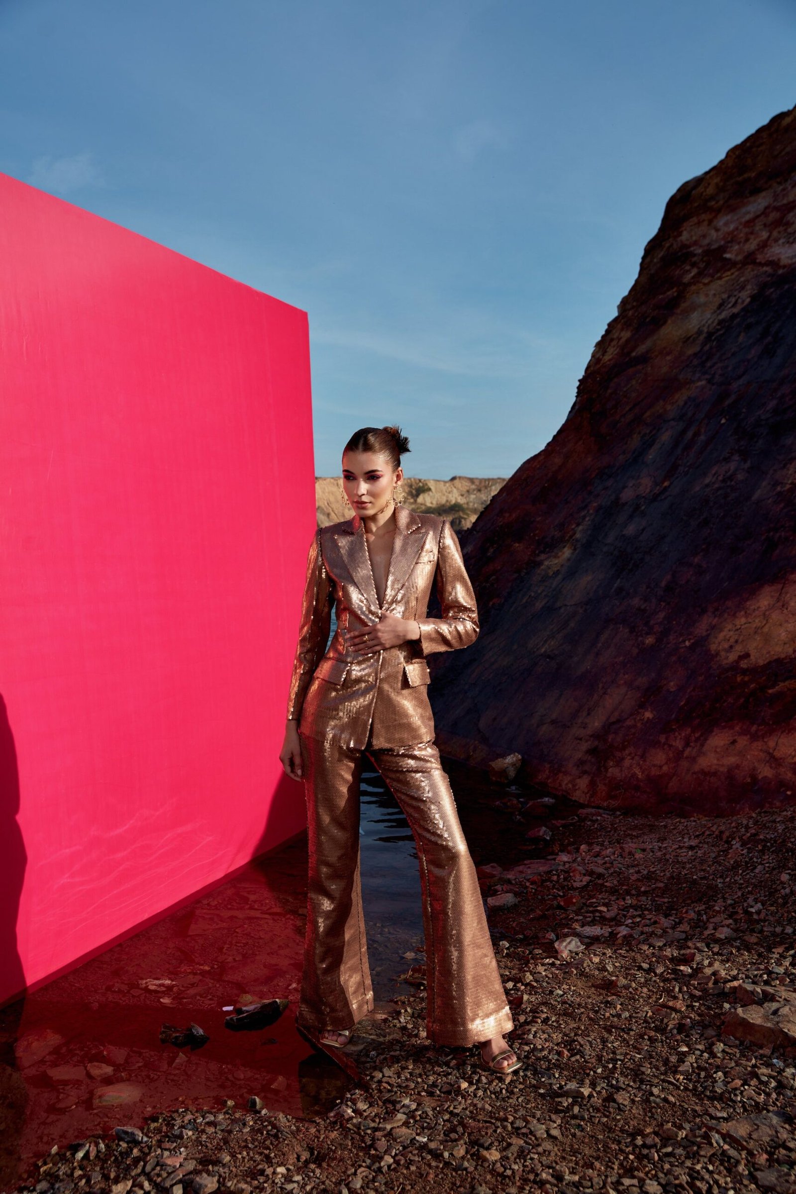 Copper-gold sequence side cut out blazer with flaired leg sequence pants