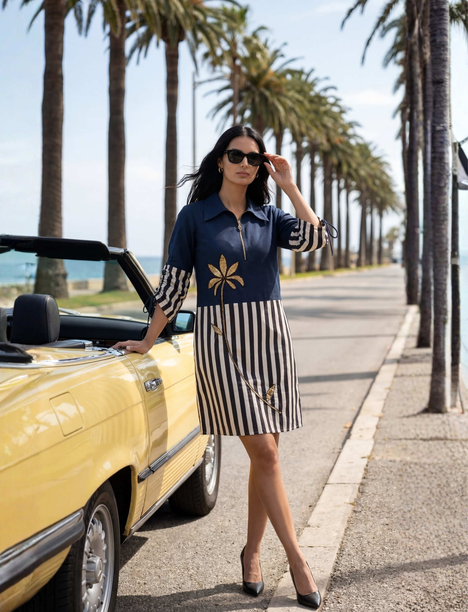 A modern color – block shift dress featuring a blue cotton uper with a zip front shirt collar, paired with a black and white vertical panel. The design is highlighted with a golden palm tree motif embroidery on the front and three quarter sleeves with striped drawstring sleeves detailing , creating a bold and contemporary statement look.