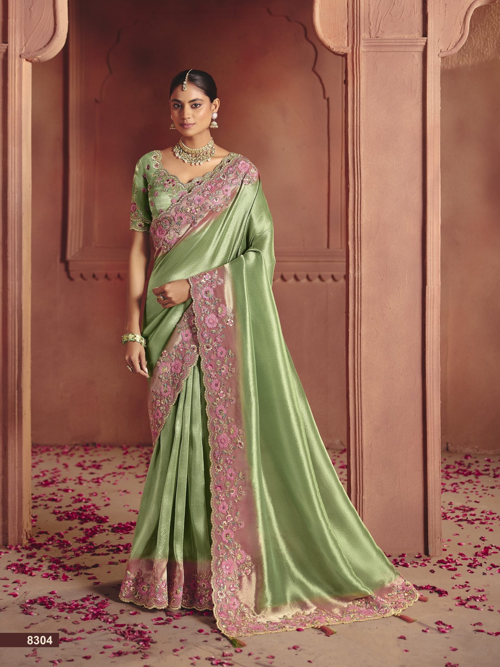 Saree Detail: This luxurious saree is crafted on a shimmering olive green base, framed by a bold pink border. The border features a contemporary scalloped edge meticulously detailed with vibrant floral motifs in zari, sequins, and multicolored threadwork.