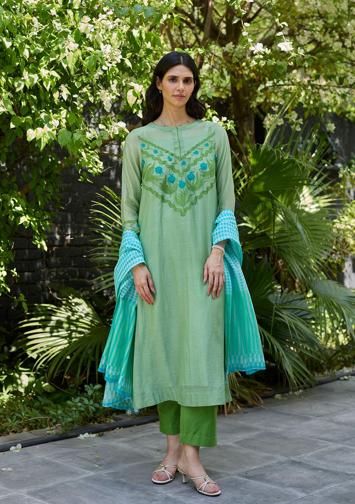 Colour: Jade green and leaf greenTextile: ChanderiKurta Length: 48″Pant Length: 37″