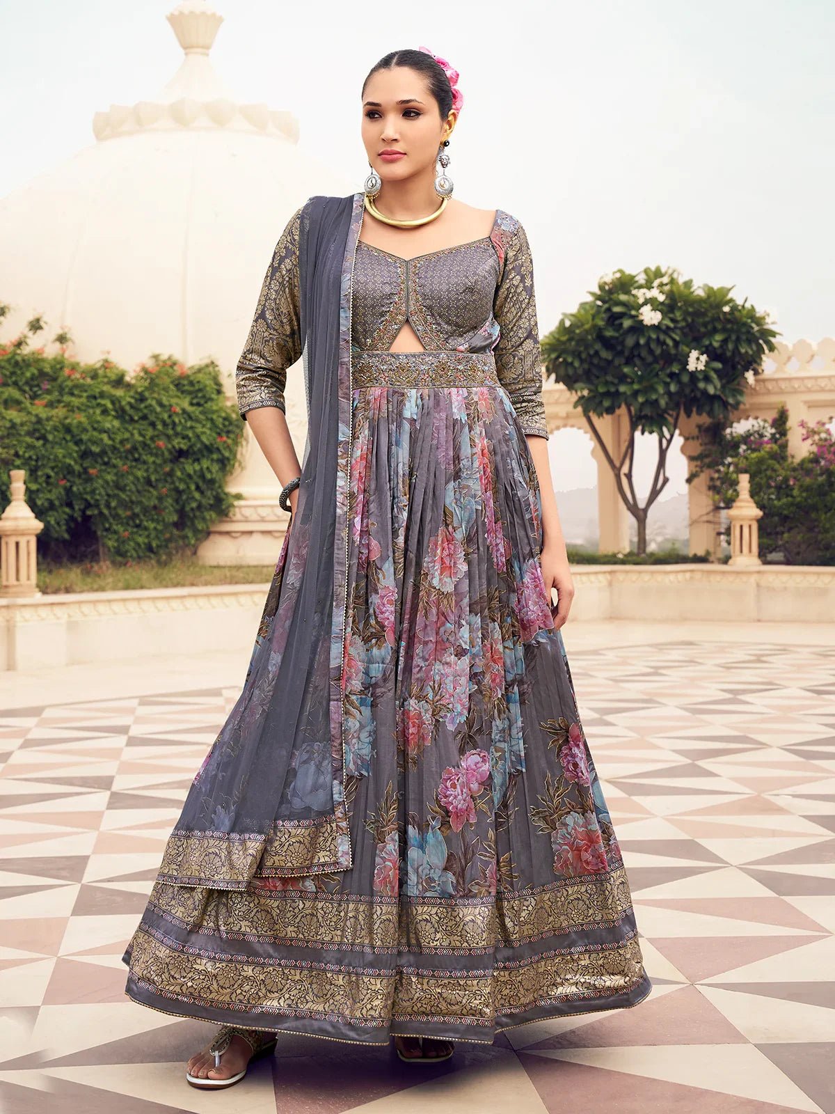Grey Indo-Western Silk Lehenga with Foil Print & Handwork