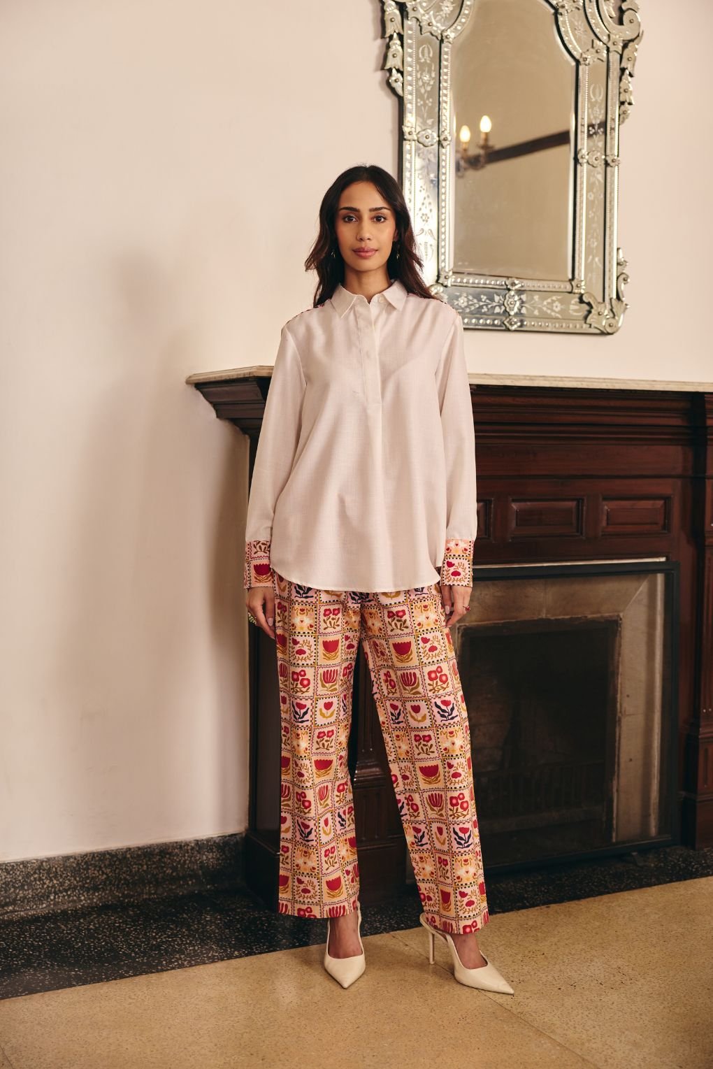 Step into festive elegance with this women?s co-ord set in luxurious premium fabric. The top features refined tailoring with delicate details, while the straight-leg pants showcase the bold floral rose grid print, creating a perfect balance of romance and modernity. Worn together, the set delivers a striking, coordinated look ideal for festive occasions, while each piece can be styled separately for versatile sophistication.