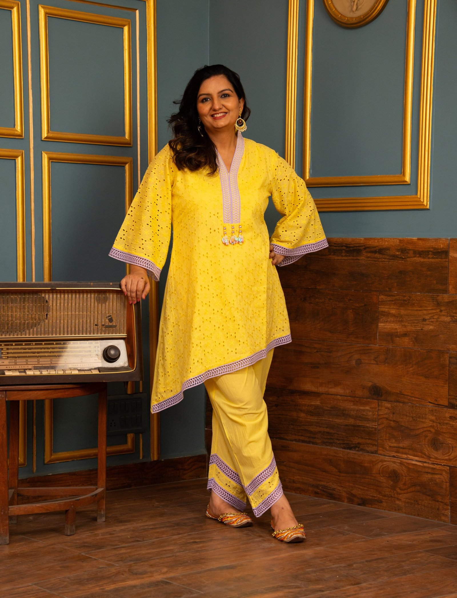 Cotton Hakoba co-ord set comes with V neckline with laces & trims, 3/4th bell sleeves embellished with lace, asymmetrical kurta styling with lace. Accompanying the kurta with straight pant lace & Hakoba border. ?