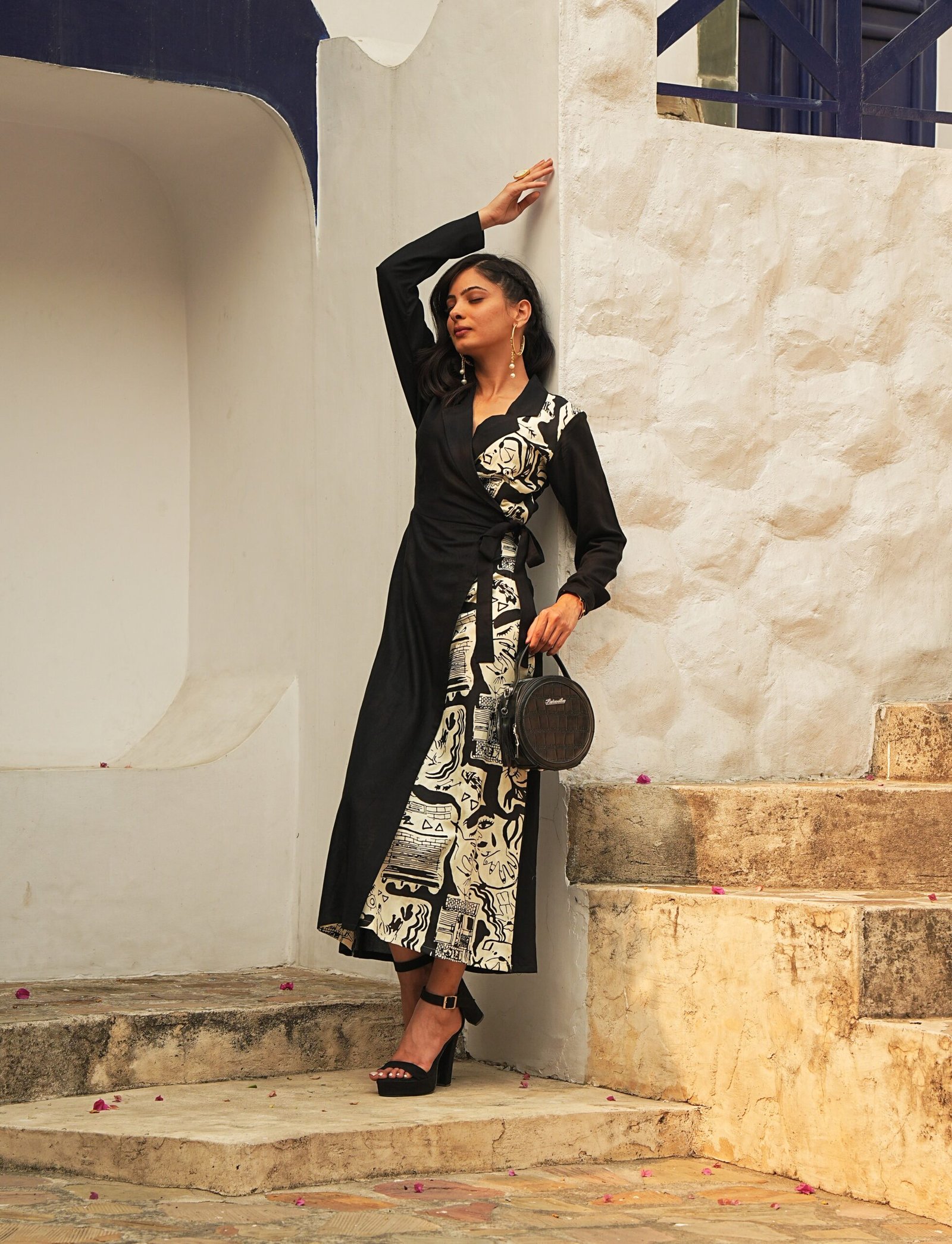 Half and half wrap style dress has a notched collar, full regular sleeves, wrap style dress with side knotting, half printed half plain style dress.