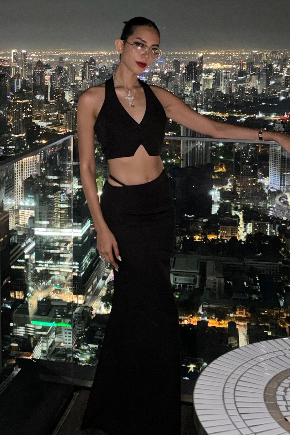 Featuring the Maria Black Halter Neck Waist Crop Jacket Paired with A Strapped Detail Skirt.