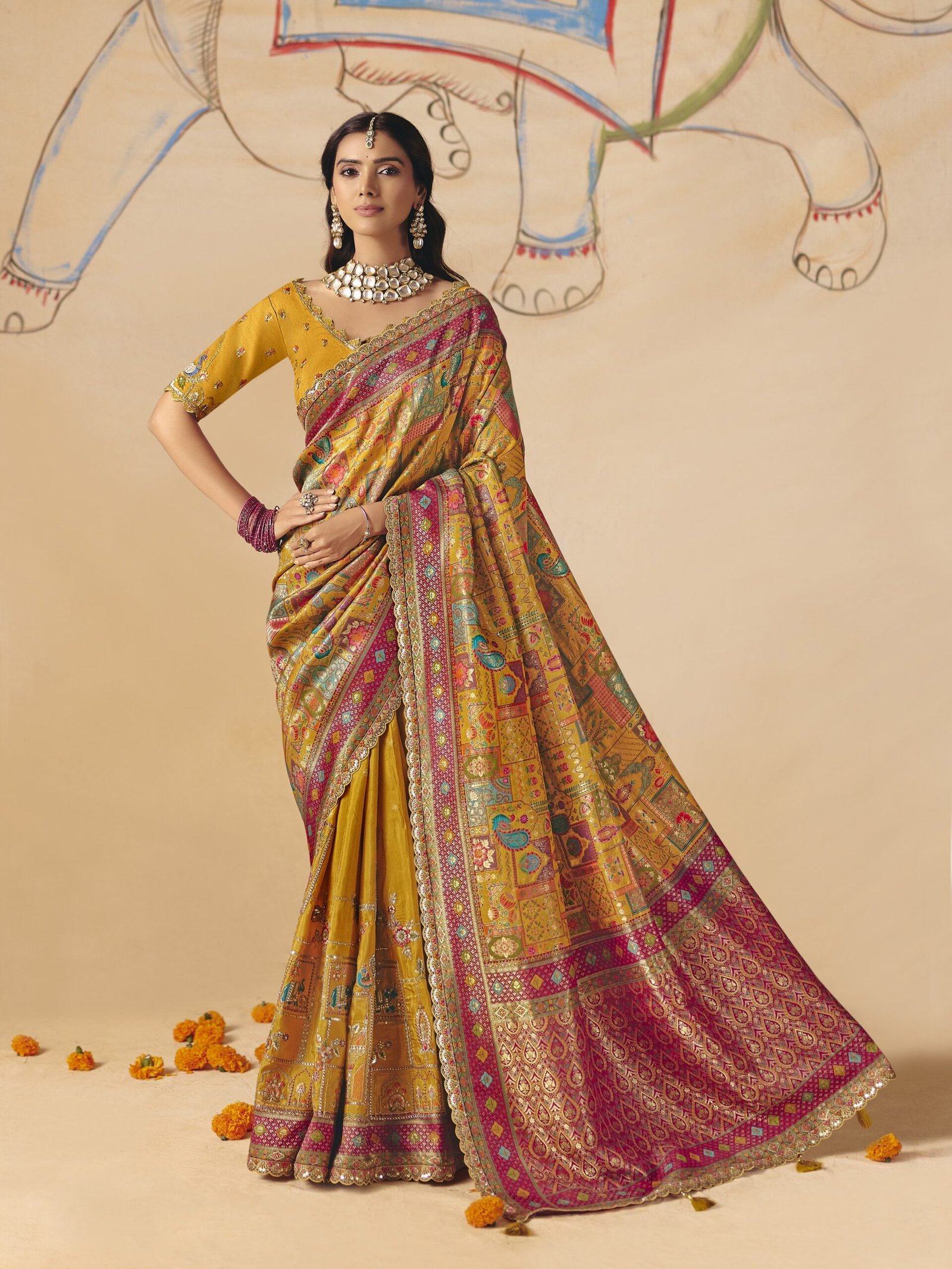 This bright honey yellow silk saree features a classic, regal silhouette with a luxurious drape and a rich natural sheen. The ensemble is intricately detailed with all-over golden thread embroidery and shimmering sequin work, creating elaborate floral and geometric patterns. High-definition position printing in multi-colored pastel colors adds depth to the pallu, while the scalloped borders ,the matching blouse is available in both unstitched and stitched options, featuring a generous blouse piece length of 1.2 meters.