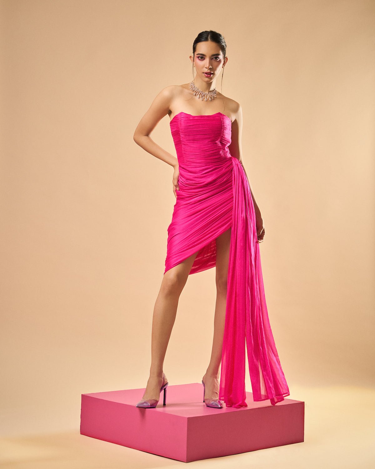 Hot Pink Draped Silhouette Party Wear Dress