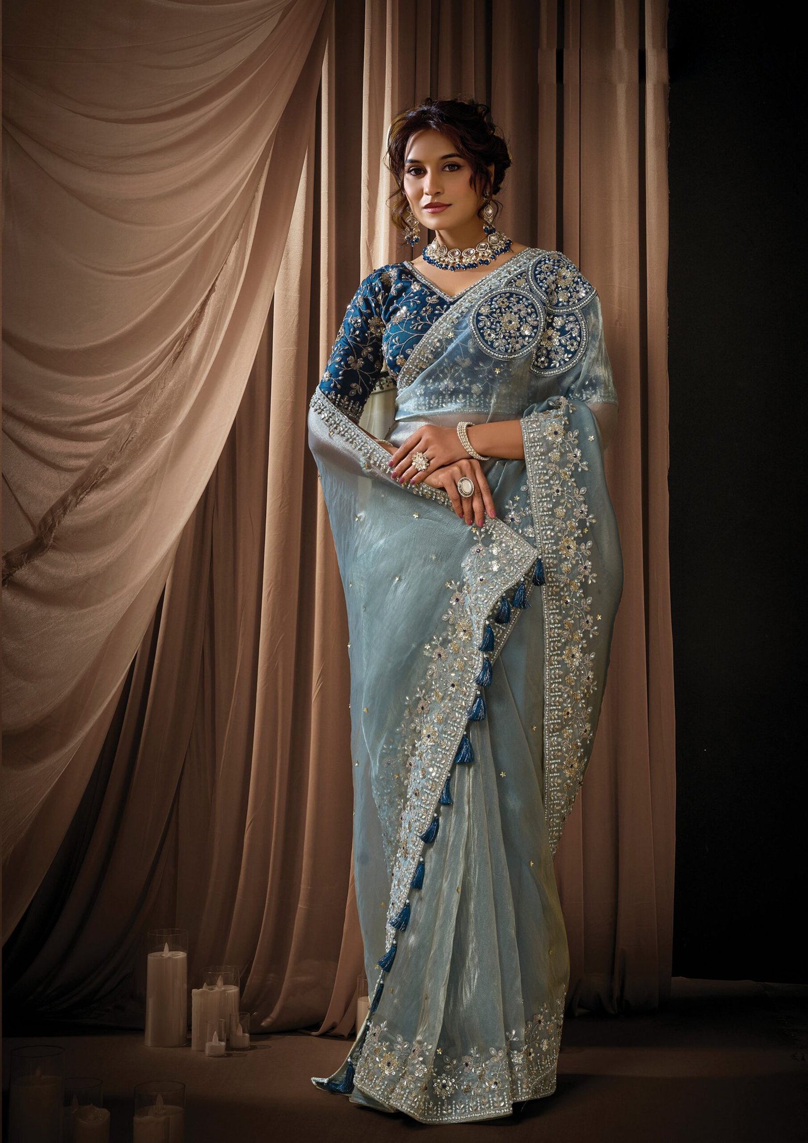 Graceful ice gray saree crafted from luxurious zari organza silk, offering a lightweight drape with a soft, elegant sheen. The saree is beautifully adorned with intricate embroidery, highlighted with golden sequins, pearl accents, and delicate stone embellishments for a refined and festive look. It is paired with a contrasting teal blue unstitched blouse fabric made from raw satin silk, allowing you to tailor the blouse according to your preferred style.