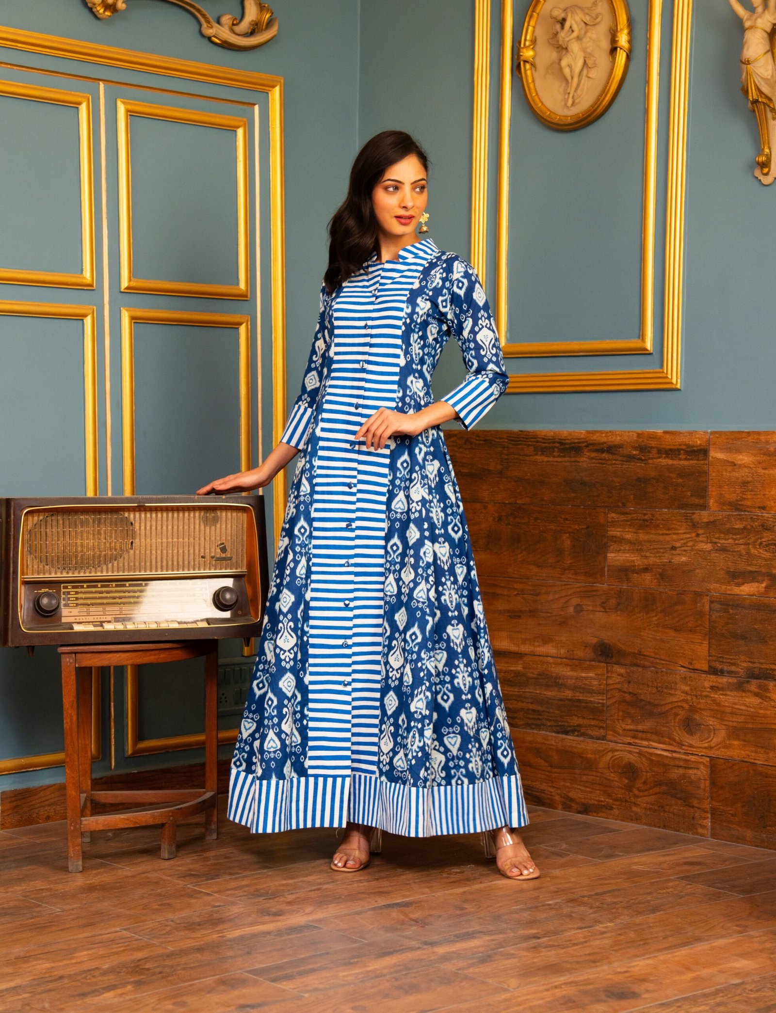 This indigo ikkat printed dress with stripes fabric has a mandarin collar. This dress comes with 3/4th sleeves and front buttons flared dress. ?